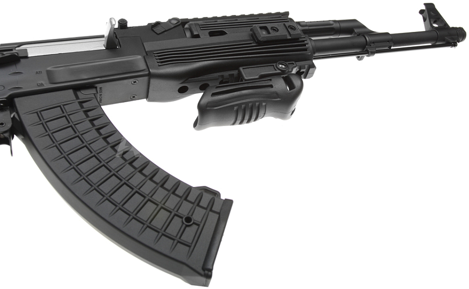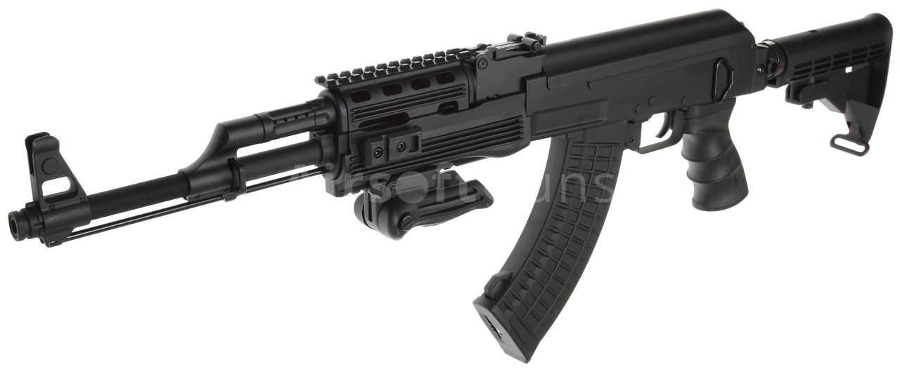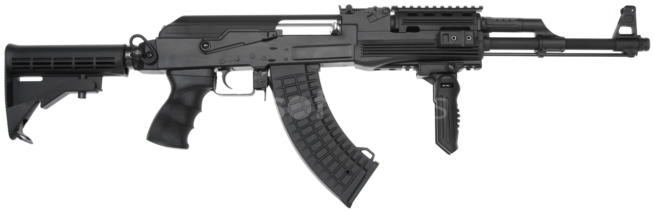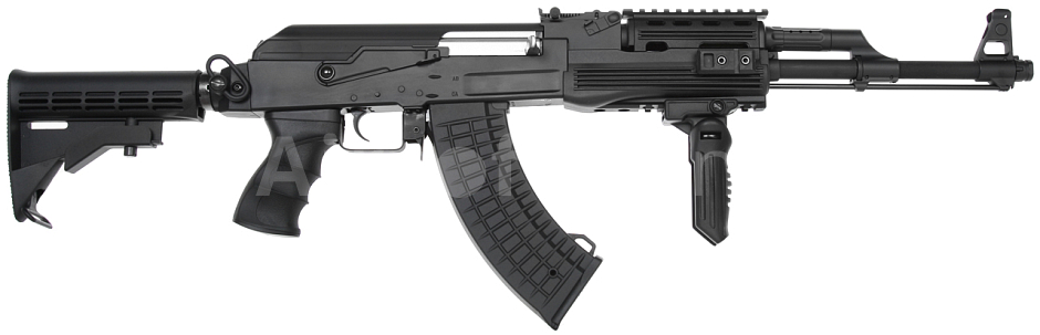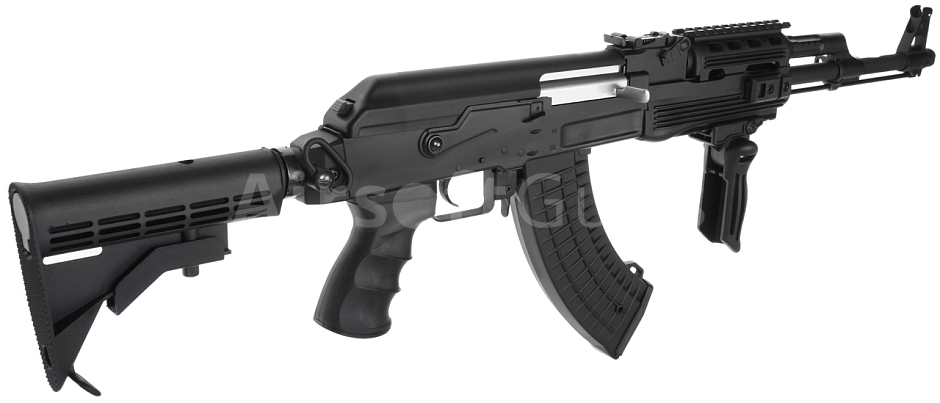 Elektrická airsoftová zbraň. Replika modela AK-47 RIS Tactical (M4 Stock) [CM.028C] Cyma Sport Edition s plastovým telom. Moderne spracovaná verzia s ergonomickou pažbičkou a RIS predpažbím, ktoré umožňuje použitie taktického príslušenstva. Vonkajšie hlaveň, plynové potrubie, kryt závera, nastaviteľná mieridlá, úchyt na popruh, lucik a ďalšie dieliky sú kovové. Táto varianta modela Tactical sa vyznačuje teleskopickou zásuvnou pažbou typa M4 (6 polôh nastavenia), a preto sa akumulátor vkladá pod kryt závera.