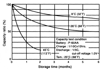 | Závislosť kapacity NiCd akumulátora na dobe skladovania pri rôznych skladovacích teplotách |