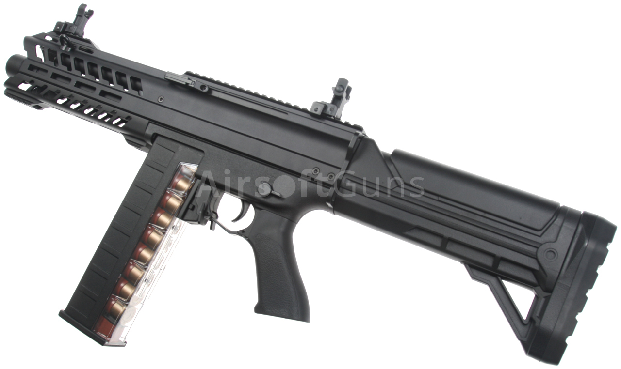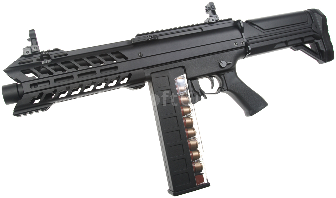 Elektrická automatická airsoftová brokovnica. Replika zbrane SGR-12 [CM.102] Cyma Platinum Edition v celokovovom vyhotovení s unikátnym systémom streľby. Je založená na osvedčenom dizajne Tokyo Marui AA-12, ktorý zaisťuje plnú kompatibilitu so zásobníkmi pre túto platformu. Vďaka unikátnemu systému s tromi hlavňami vystrelí tri broky súčasne pri každom stlačení spúšte – v poloautomatickom aj plne automatickom režime.
