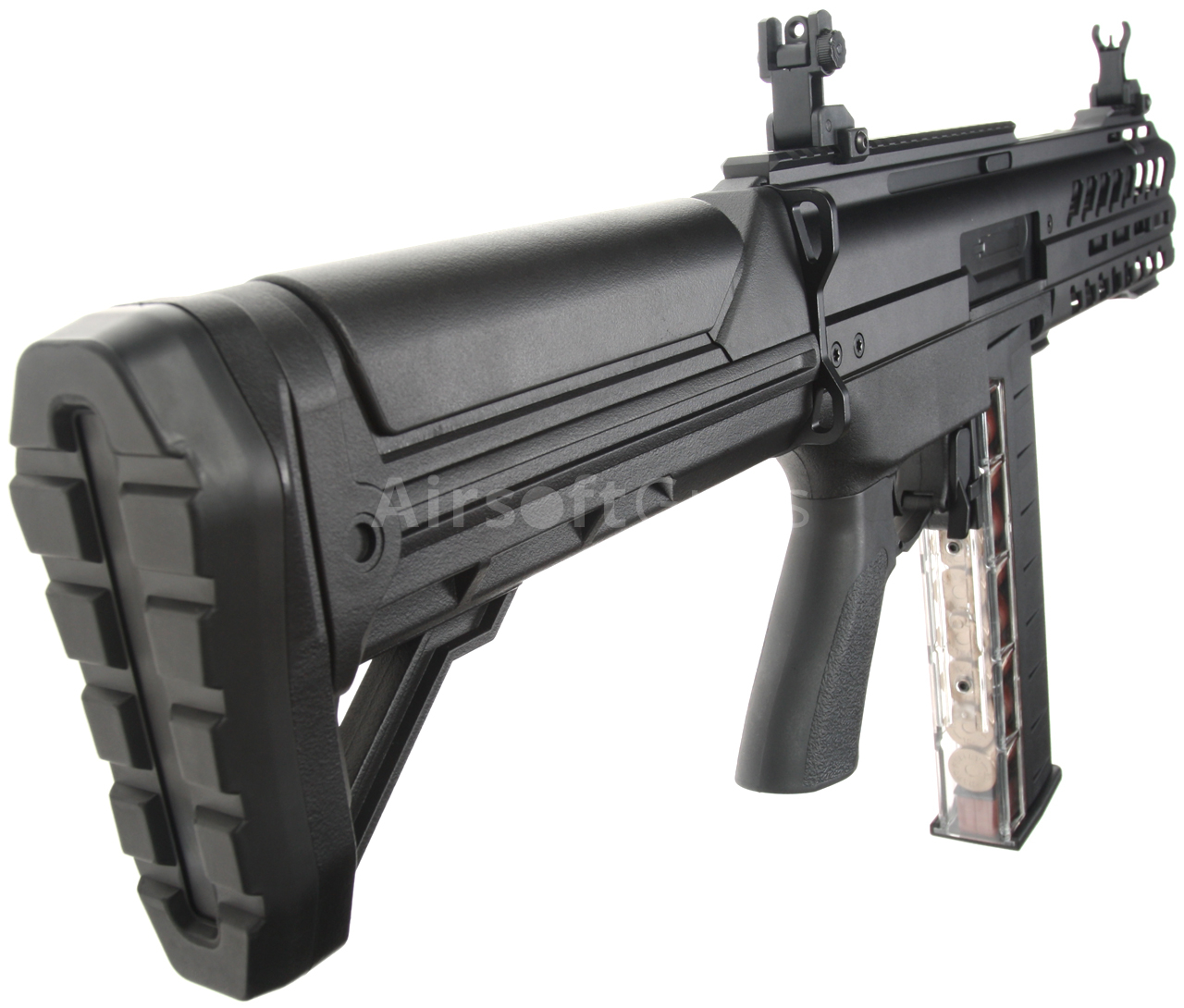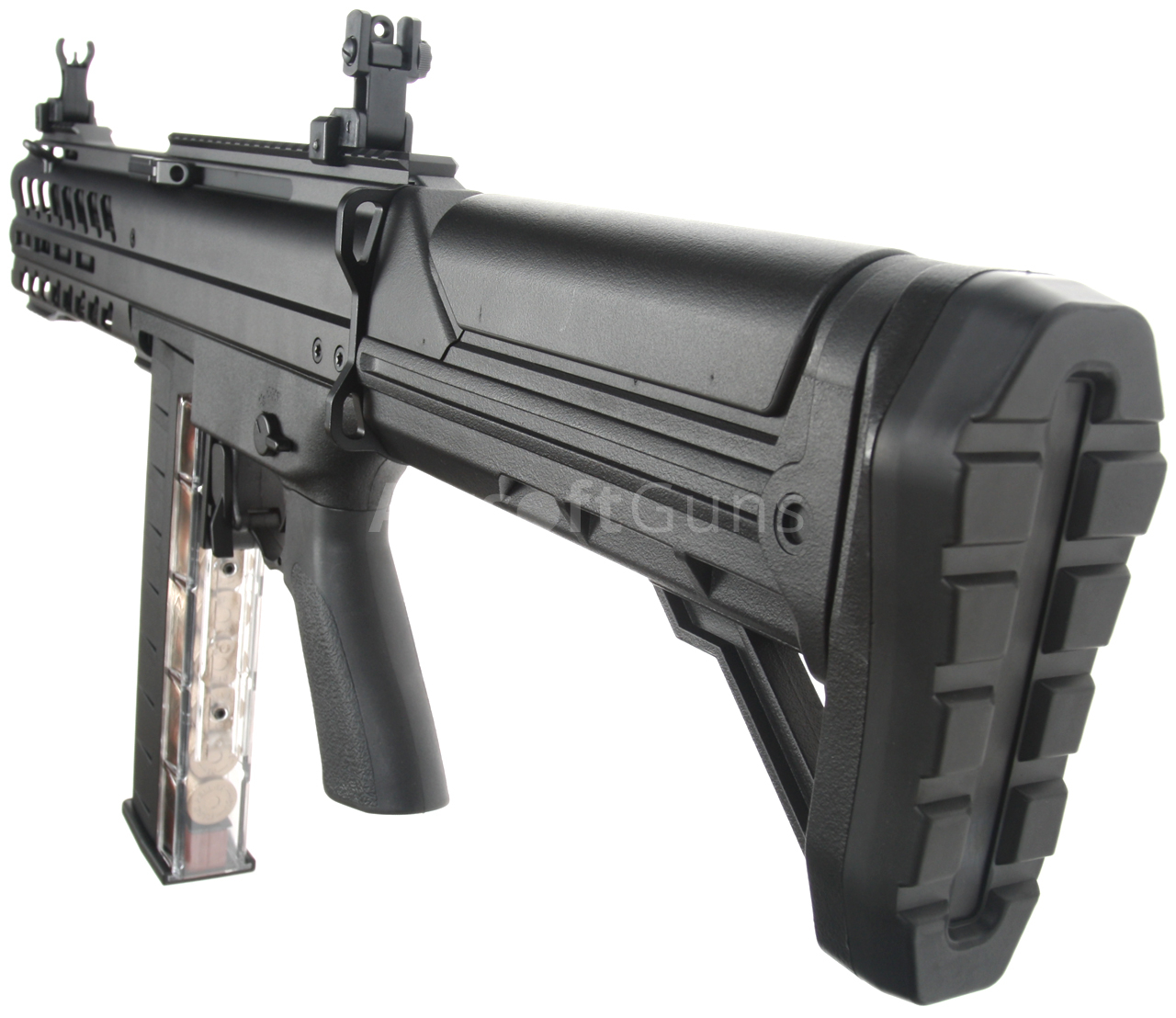 Pevná pažba s lícnicou je tiež vyrobená z polyméru a pod jej gumovou pätkou je priestor na batériu. Súčasťou balenia je polymérový zásobník s kapacitou 93 BB s priehľadnou zadnou stenou s imitáciou brokových nábojov pre realistickejší vzhľad.