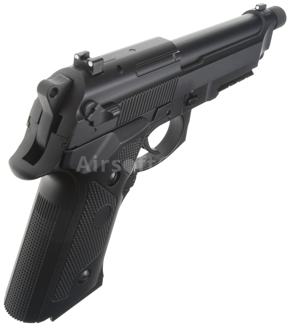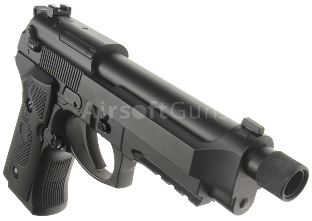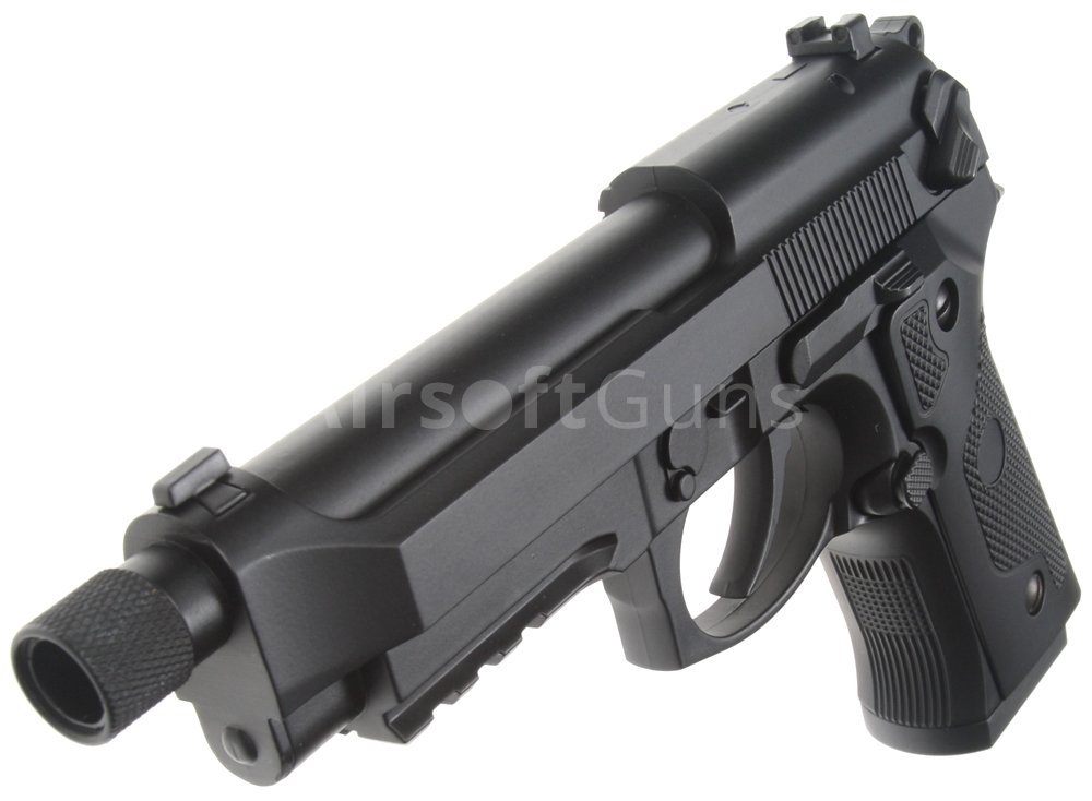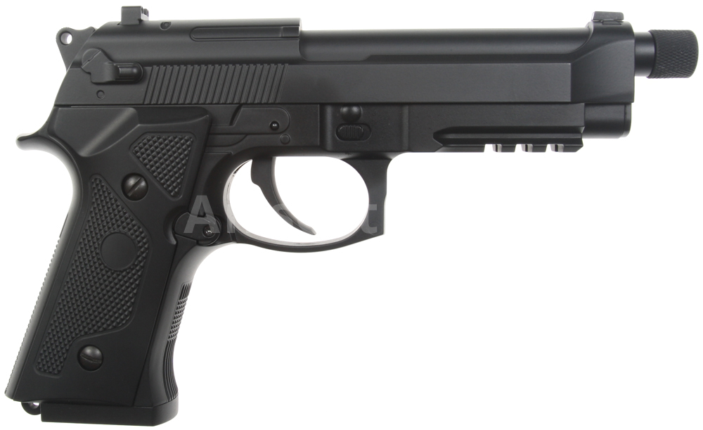 Elektrická airsoftová zbraň AEP. Replika pištole Beretta M9A1 [CM.132S] od Cyma s MOSFET spínaním a čiernym kovovým záverom. Zbraň je vybavená RIS lištou na spodnej strane rámu. Hlaveň má 14 mm (ľavostranný) závit na montáž tlmiča. Ide o vylepšenú pištoľ AEP, ktorá disponuje moderným elektronickým spínaním pomocou MOSFET. Toto riešenie zabezpečuje dlhšiu životnosť spínacích kontaktov a umožňuje lepší tok prúdu obvodom. Vylepšená verzia pištole bola ďalej zdokonalená oceľovými guľôčkovými ložiskami a nízkoodporovým káblovým vedením. Tieto úpravy spolu s LiPol batériou zabezpečujú rýchlu odozvu a rýchlu streľbu pri stlačení spúšte. Zabezpečujú tiež vyššiu rýchlosť streľby a väčší počet výstrelov na jedno nabitie batérie ako modely s NiMH batériami.