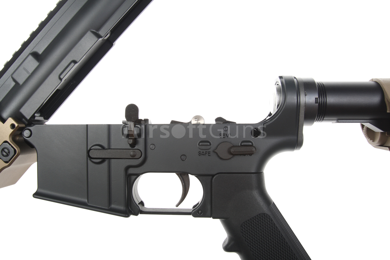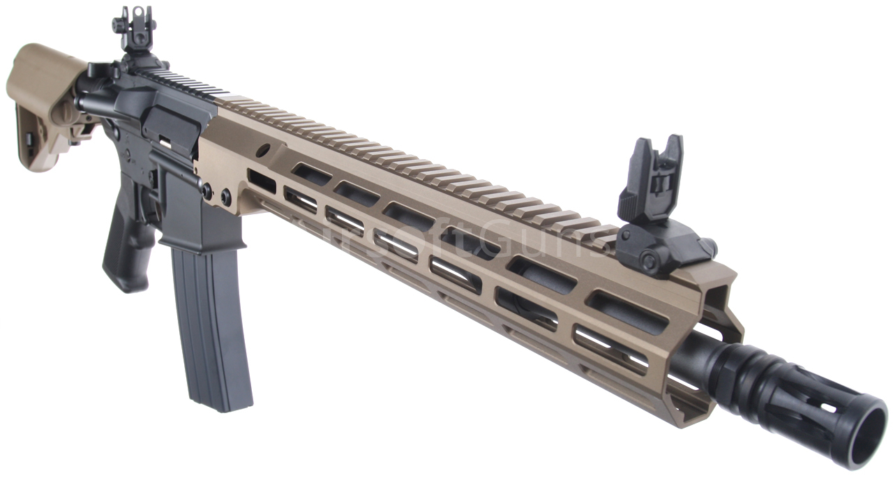 Zbraň je vybavená teleskopickou pažbou Crane Stock v farbe FDE, ktorá ponúka 4 polohy nastavenia dĺžky. 14,5-palcová kovová vonkajšia hlaveň je vybavená klasickým kompenzátorom M4, ktorý je pripevnený na 14 mm ľavotočivom závite.