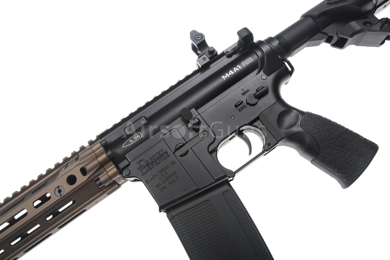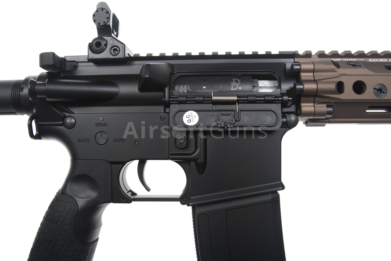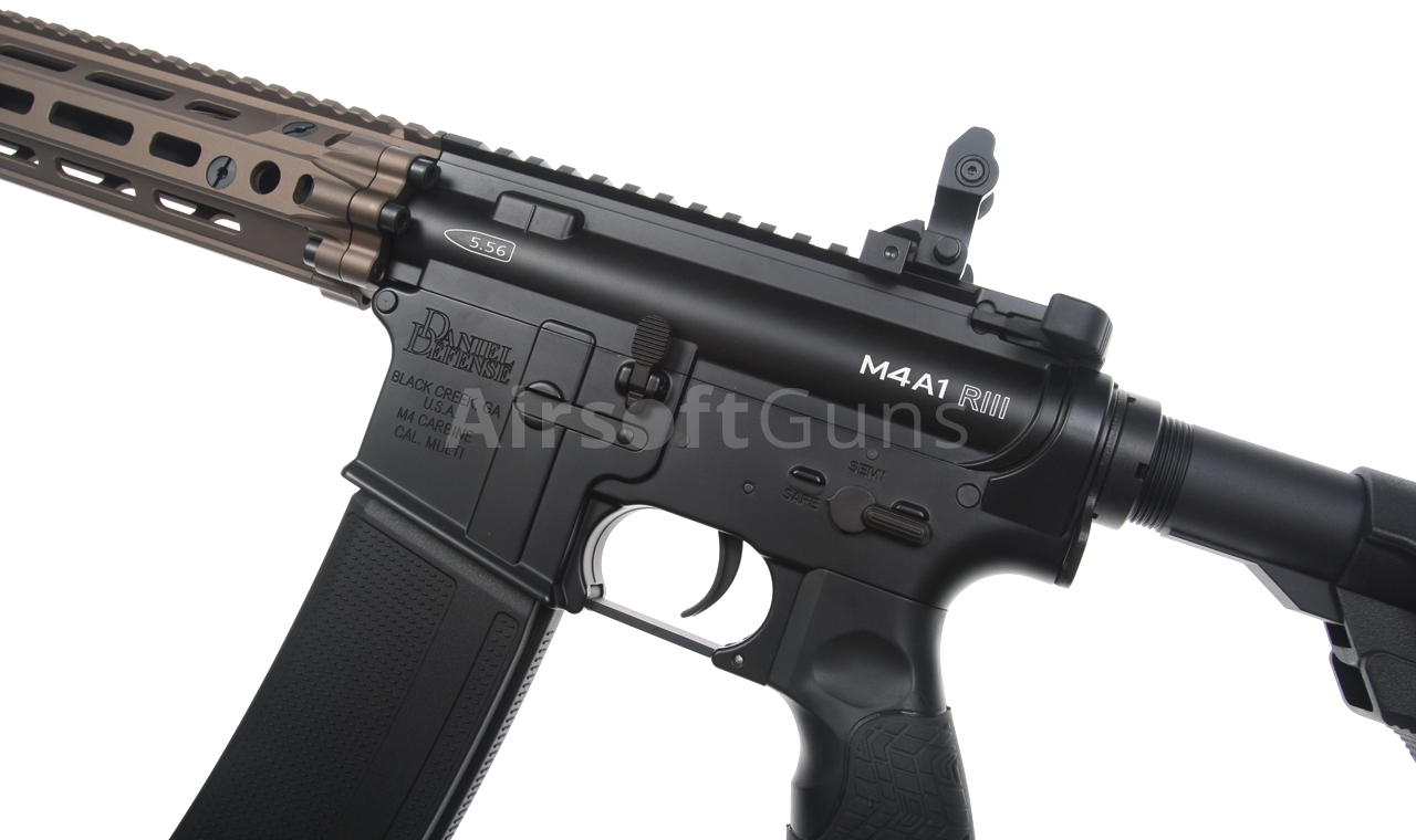 Zbraň je vybavená párom sklopných a plne nastaviteľných kovových mieridiel. Napriek tomu ponúka jednoduchú montáž kolimátorového mieridla alebo zväčšovacieho puškohľadu. Pažba Daniel Defence perfektne sedí na telo a ponúka maximálnu ergonómiu uchopenia. Na upevnenie popruhu sa používa obojstranné oceľové pútko medzi telom a pažbou alebo otvory QD na pažbe a predpažbí. Zbraň má plne funkčný vyhadzovací otvor, plne funkčné tlačidlo poistky závorníka a rukoväť závorníka. Verne je napodobená aj funkcia poistky závorníka. Táto replika je jednoducho vyladená k dokonalosti, pokiaľ ide o vernú napodobeninu strelnej zbrane. Žiadne podvádzanie, na ktoré sme zvyknutí od iných, často drahších výrobcov.