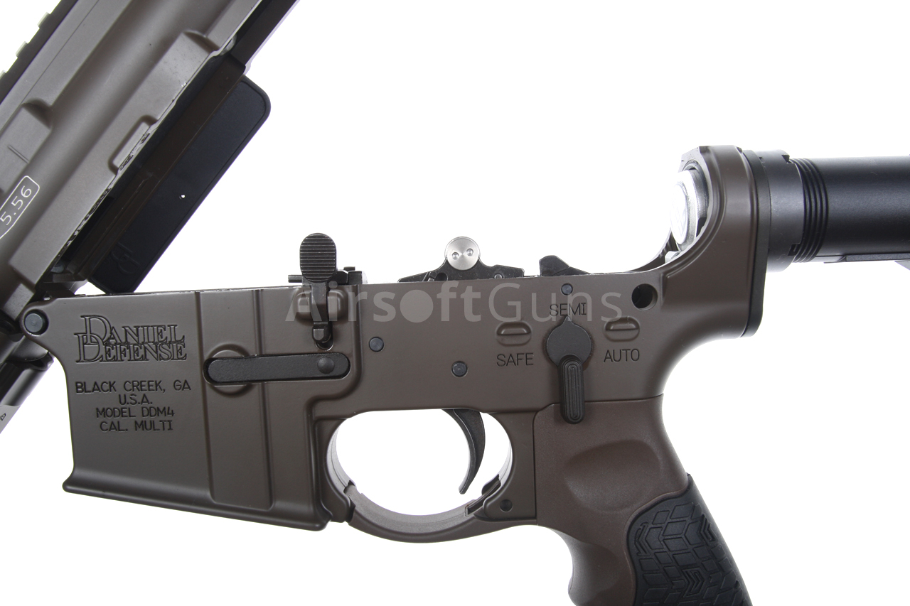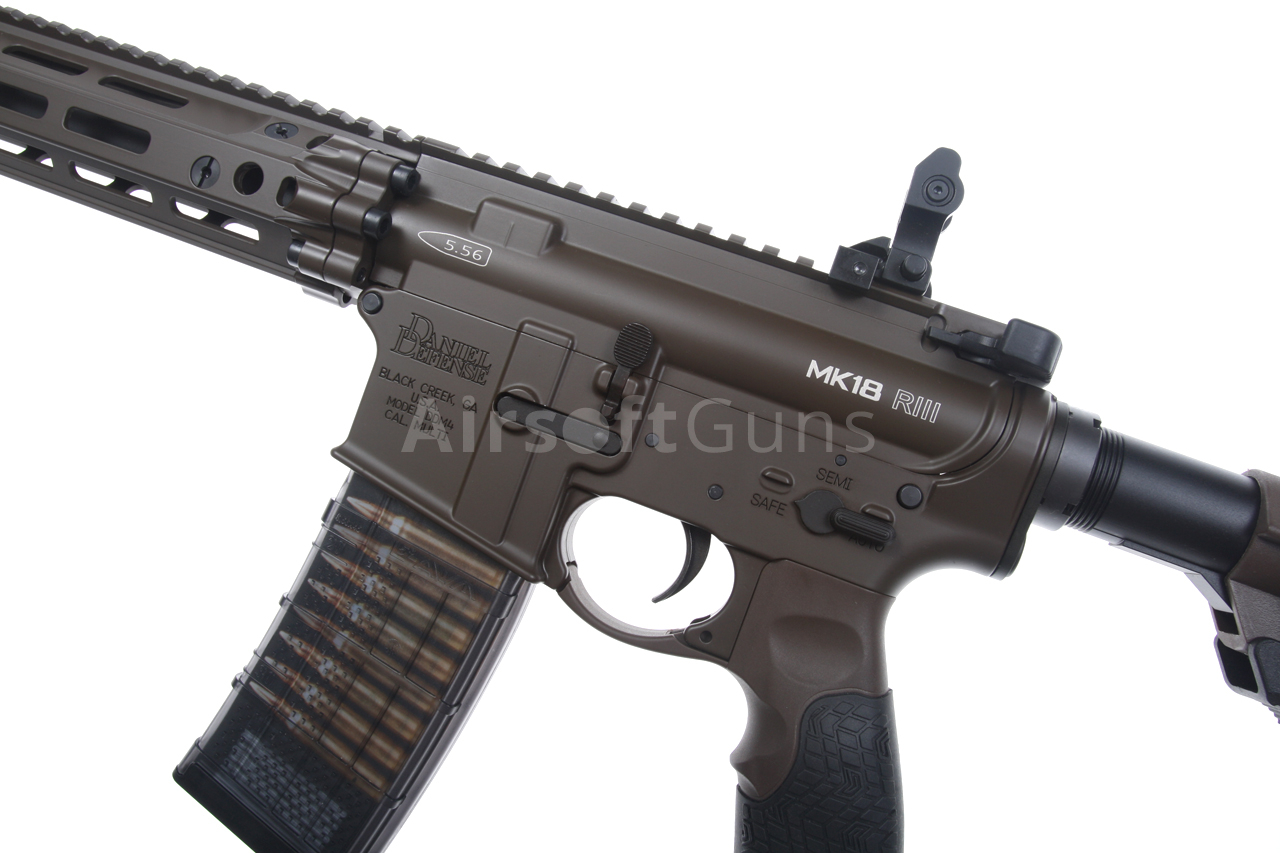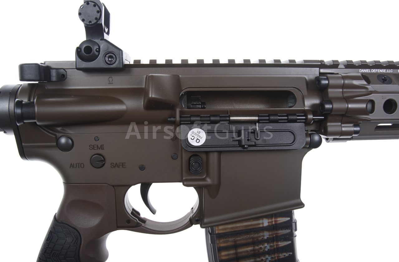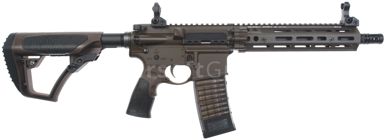 Táto skrátená verzia karabíny AR15 má krásne spracované hnedé telo s originálnym razítkom Daniel Defence (licencované spoločnosťou EMG) a jedinečným sériovým číslom. Zbraň je vybavená moderným CNC kovovým RIII M-Lok predpažbím (9,5 palca), ktoré je oveľa ľahšie a užšie ako štandardné RIS a preto zaručuje skvelý úchop. Moderný systém M-Lok umožňuje montáž taktického príslušenstva podľa preferencií každého používateľa.