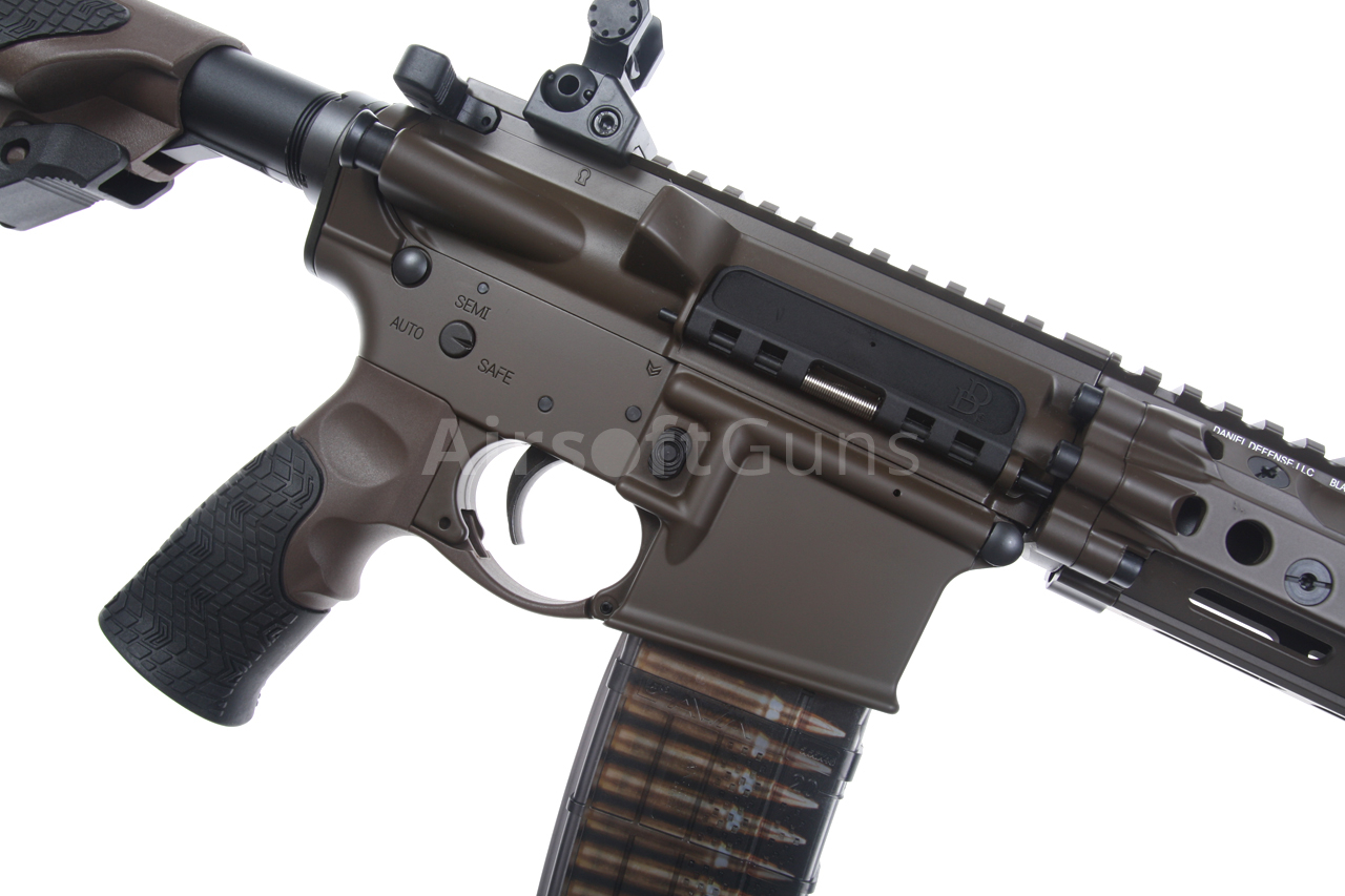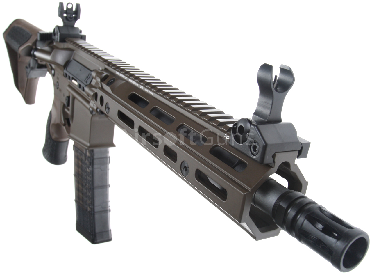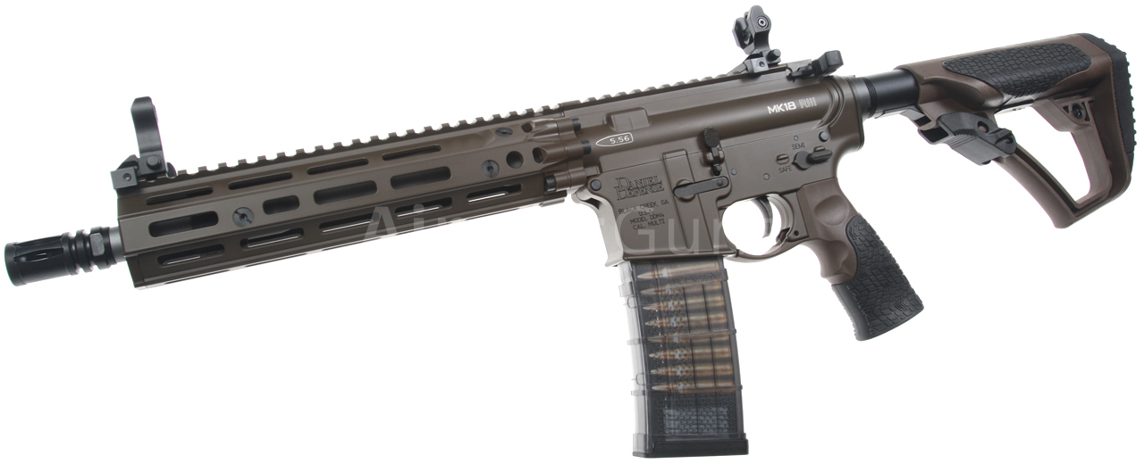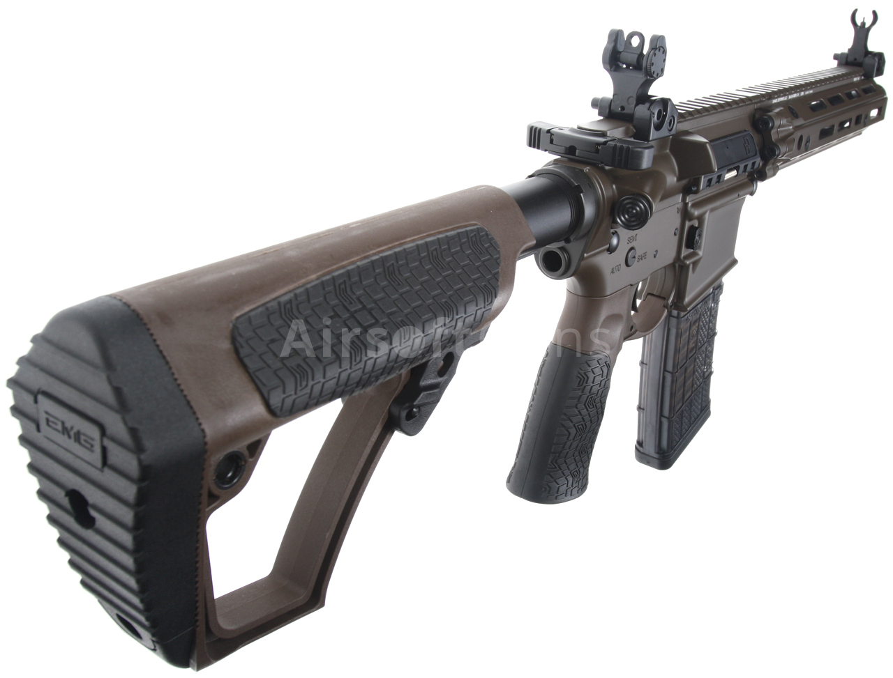 Táto skrátená verzia karabíny AR15 má krásne spracované hnedé telo s originálnym razítkom Daniel Defence (licencované spoločnosťou EMG) a jedinečným sériovým číslom. Zbraň je vybavená moderným CNC kovovým RIII M-Lok predpažbím (9,5 palca), ktoré je oveľa ľahšie a užšie ako štandardné RIS a preto zaručuje skvelý úchop. Moderný systém M-Lok umožňuje montáž taktického príslušenstva podľa preferencií každého používateľa.