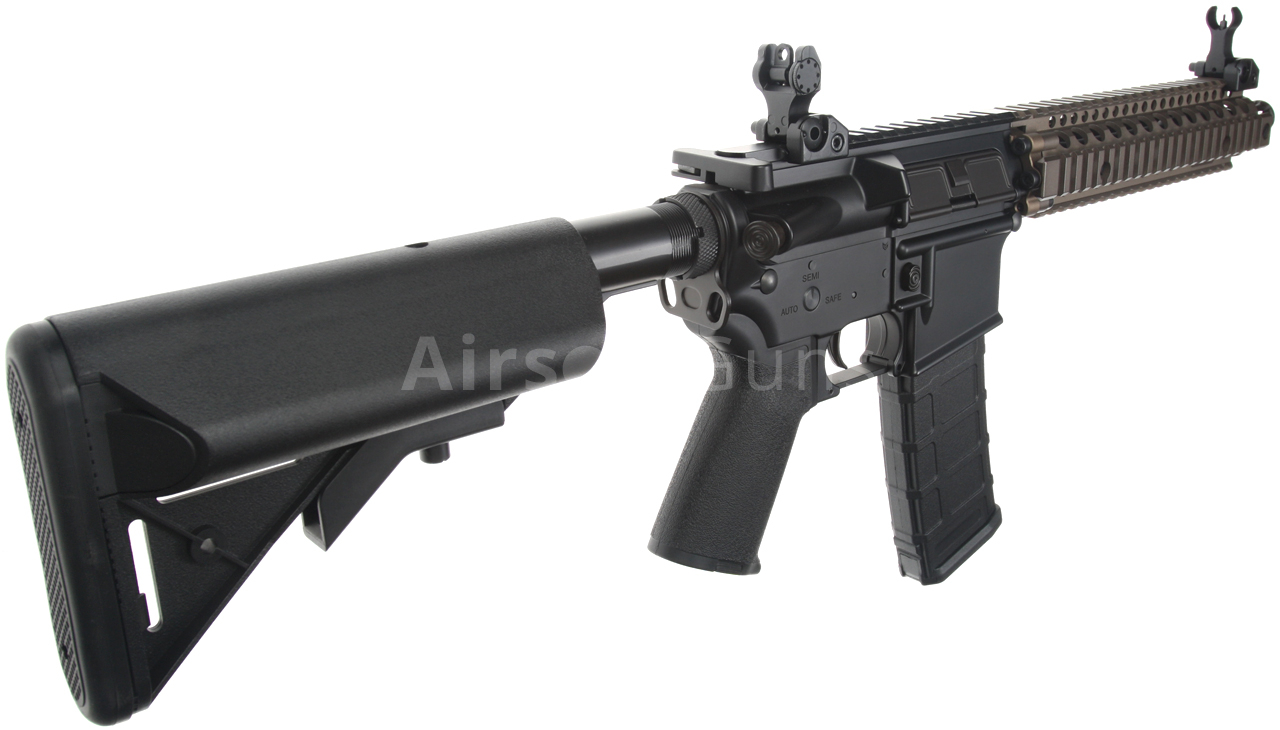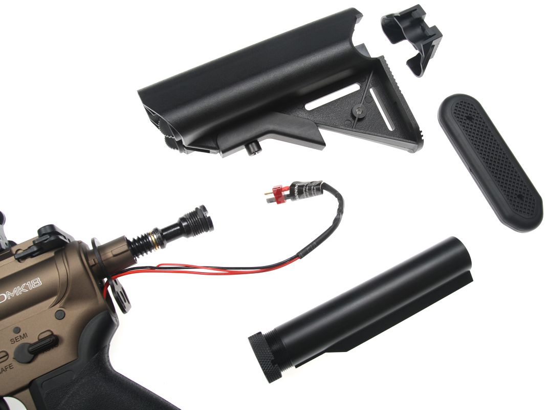 Zbraň je vybavená teleskopickou sklopnou pažbou Crane Stock, ktorá ponúka 6 polôh nastavenia dĺžky a umožňuje vloženie odporúčaného typu LiPol batérie. 10,3-palcová kovová vonkajšia hlaveň je vybavená klasickým kompenzátorom M4A1, ktorý je pripevnený na 14 mm ľavotočivom závite.