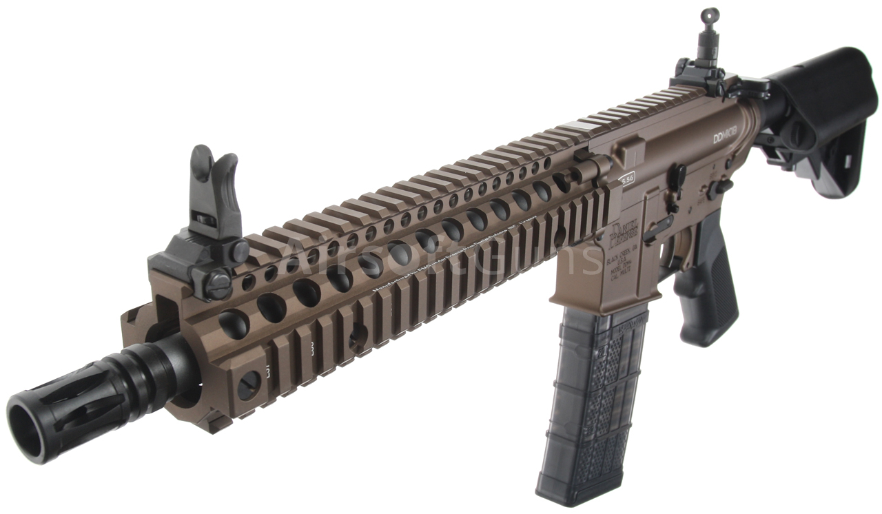 Táto skrátená verzia karabíny AR15 má krásne spracované telo v farbe FDE s originálnym razítkom Daniel Defence (licencované spoločnosťou EMG) a jedinečným sériovým číslom. Zbraň je vybavená moderným CNC kovovým voľne plávajúcim RII predpažbím (9,5 palca), ktoré umožňuje montáž taktického príslušenstva podľa preferencií každého používateľa.
