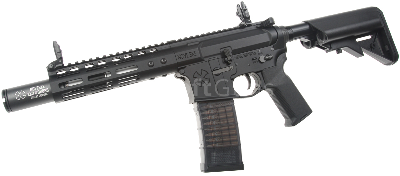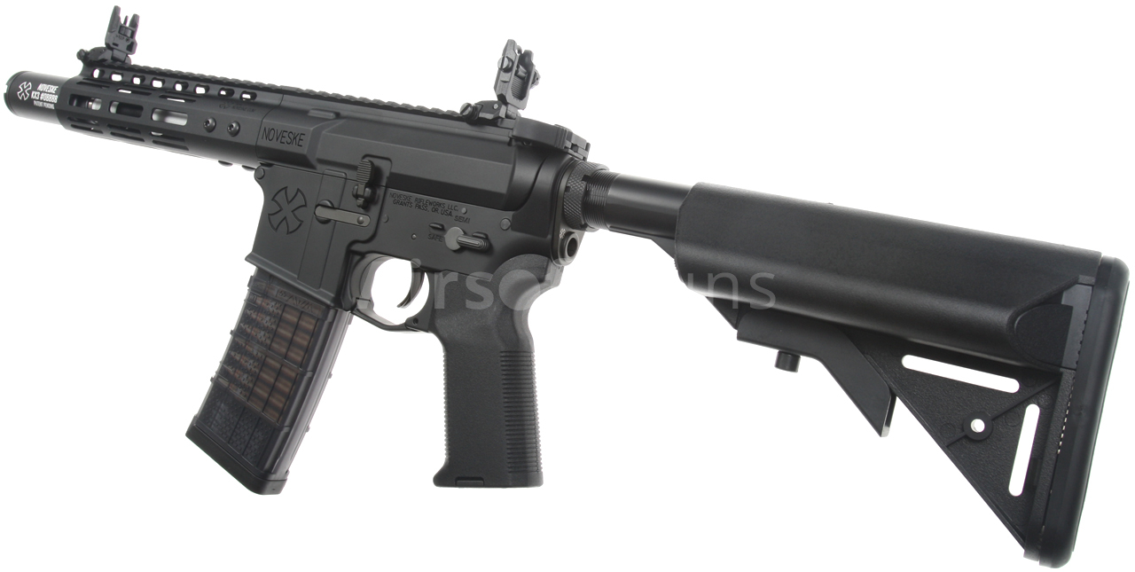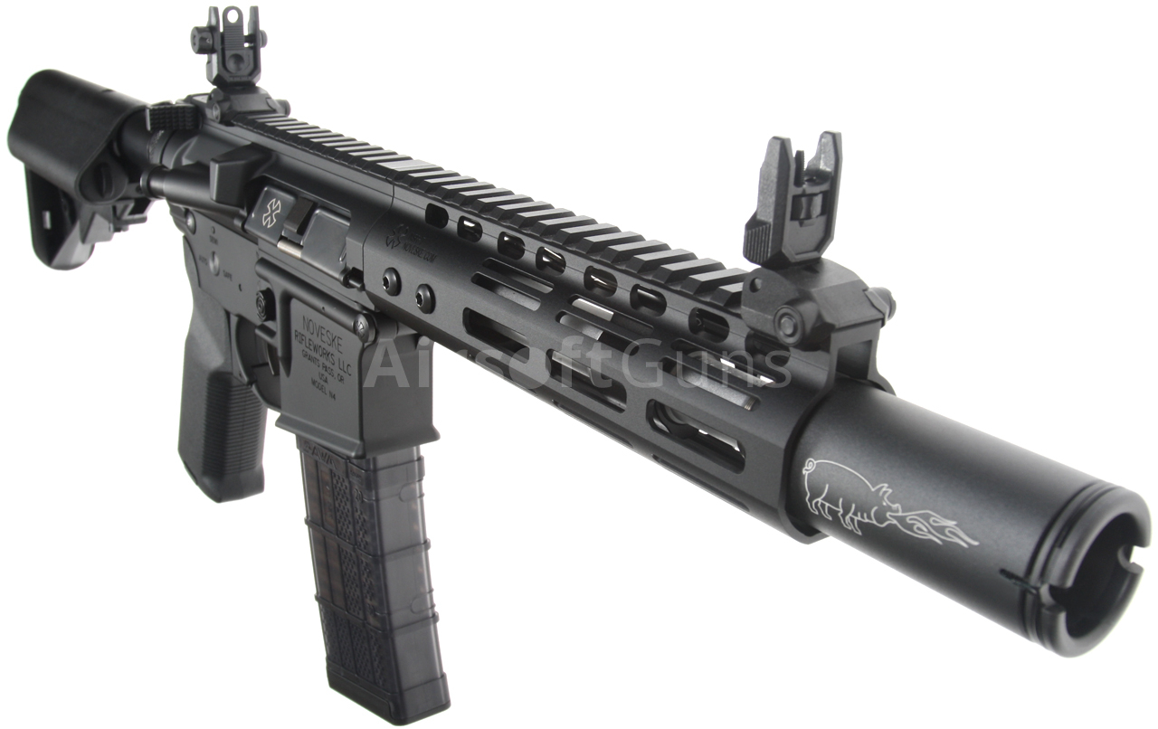 Zbraň je vybavená teleskopickou pažbou Crane Stock, ktorá ponúka 6 polôh nastavenia dĺžky a umožňuje vloženie odporúčaného typu LiPol batérie. 7-palcová kovová vonkajšia hlaveň je vybavená tlmičom záblesku KX-3 Firepig, ktorý je pripevnený na 14 mm ľavotočivý závit. Hlaveň je striebornej farby, čo je typický znak zbraní vyrábaných americkou spoločnosťou Noveske.