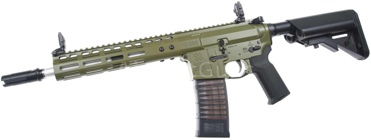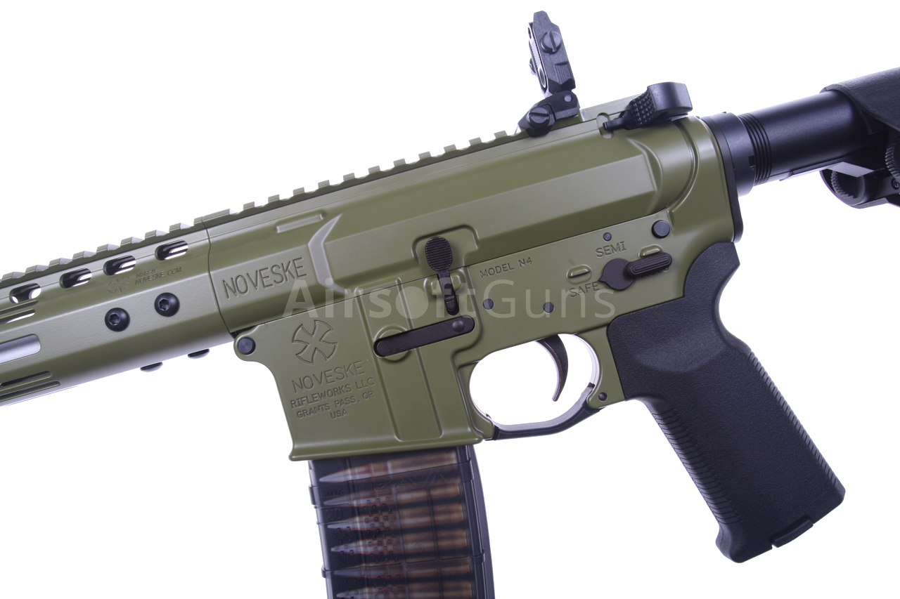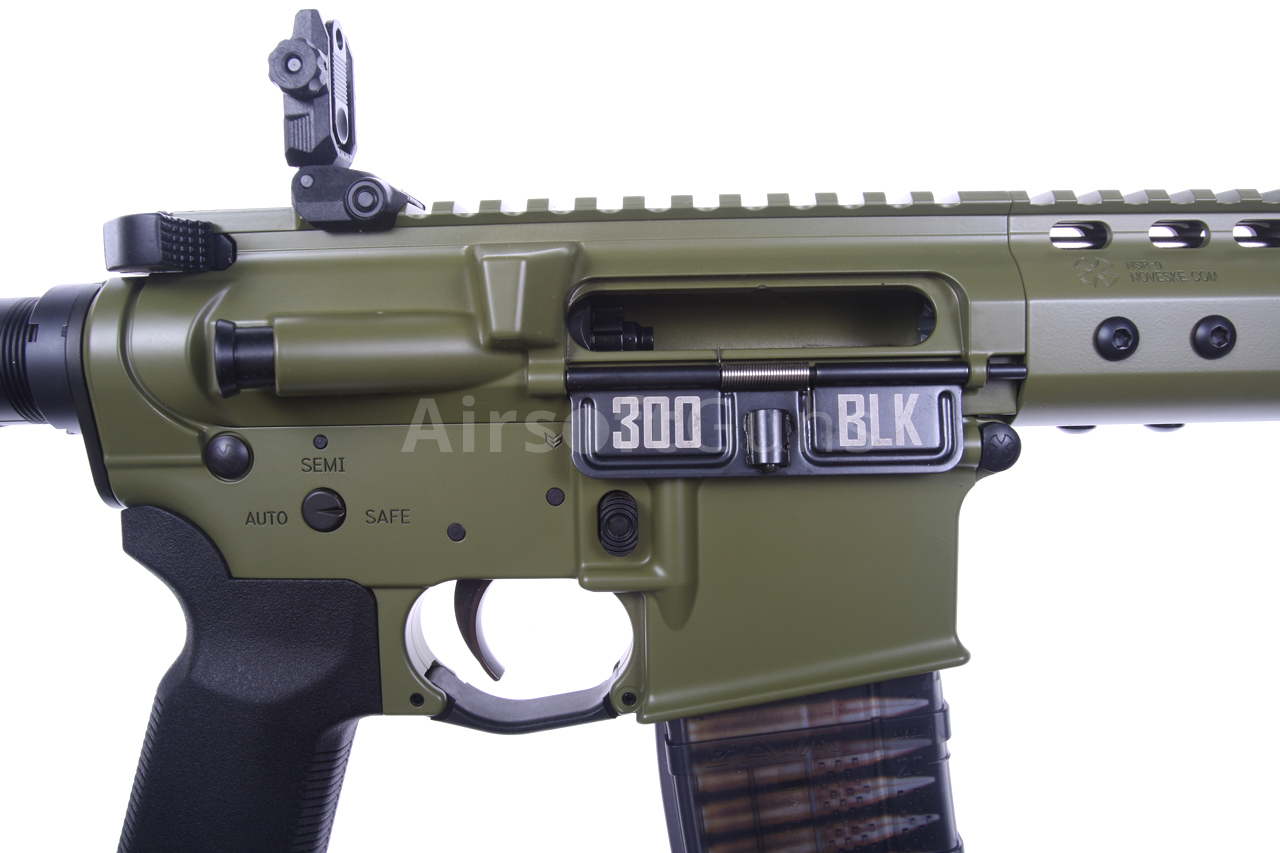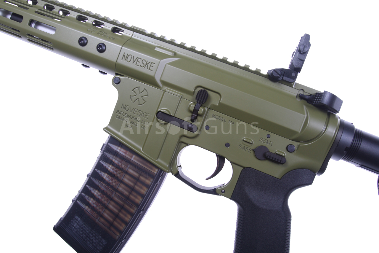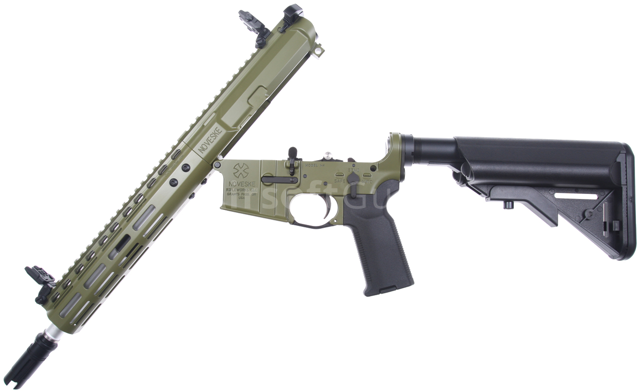 Táto skrátená verzia karabíny AR15 má krásne spracované telo v zelenej farbe Bazooka Green s originálnym razítkom Noveske (licencované spoločnosťou EMG) a jedinečným sériovým číslom. Zbraň je vybavená moderným CNC kovovým predpažbím Noveske NSR-9 M-Lok (dĺžka 9 palcov), ktoré je oveľa ľahšie a užšie ako štandardné RIS a preto zaručuje skvelý úchop. Moderný systém M-Lok umožňuje montáž taktického príslušenstva podľa preferencií každého používateľa.