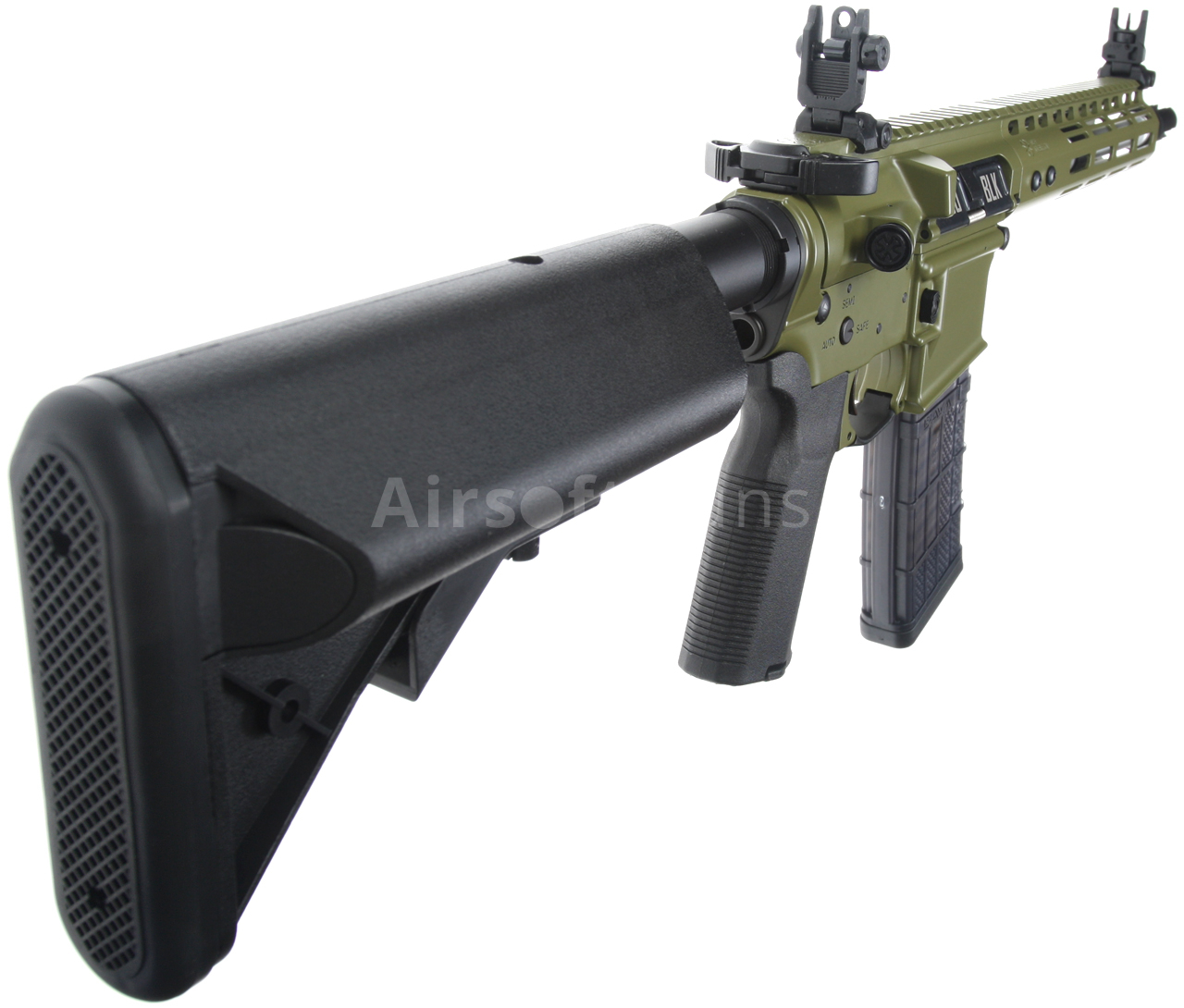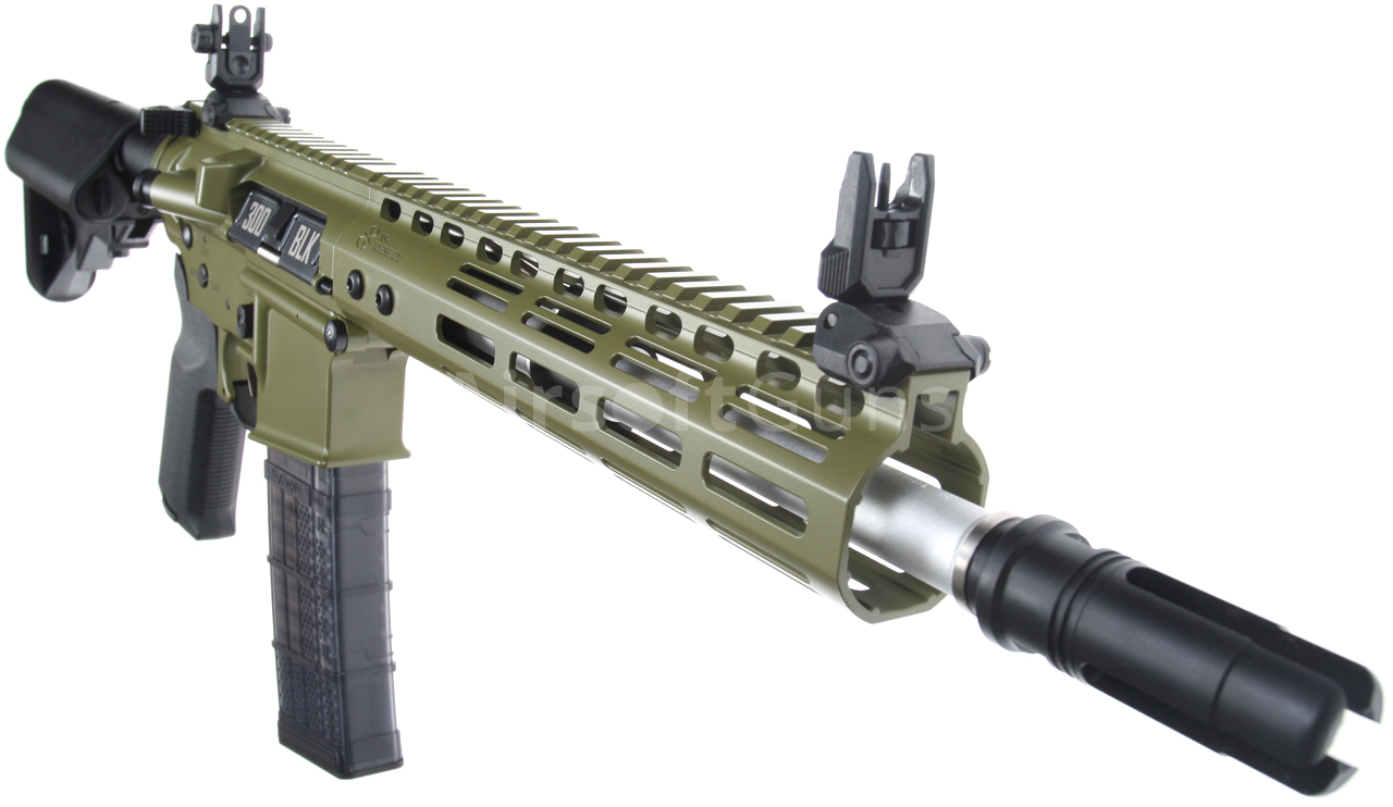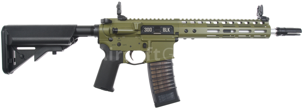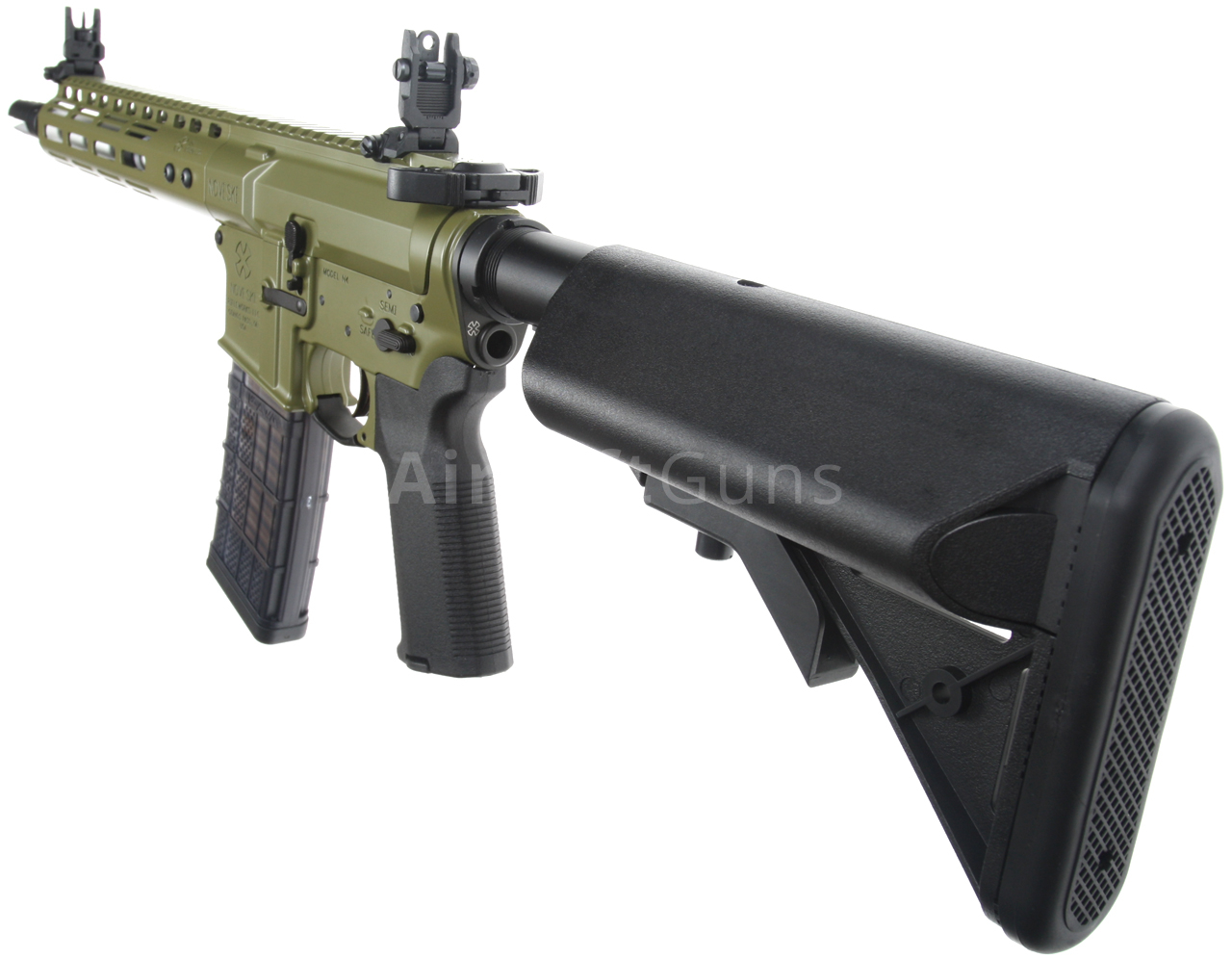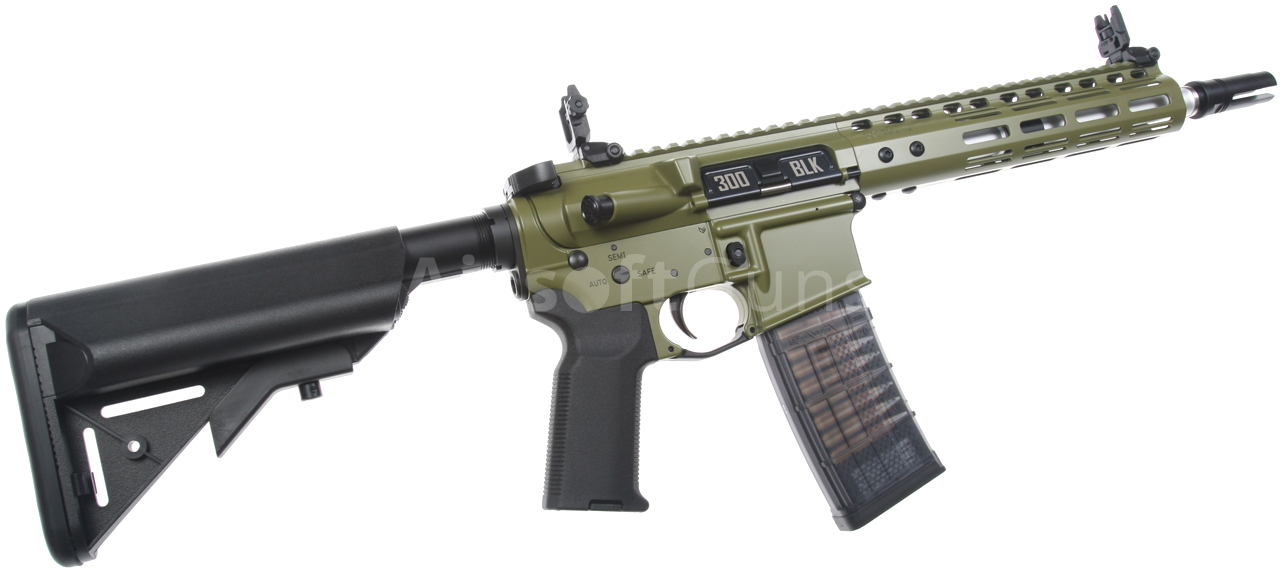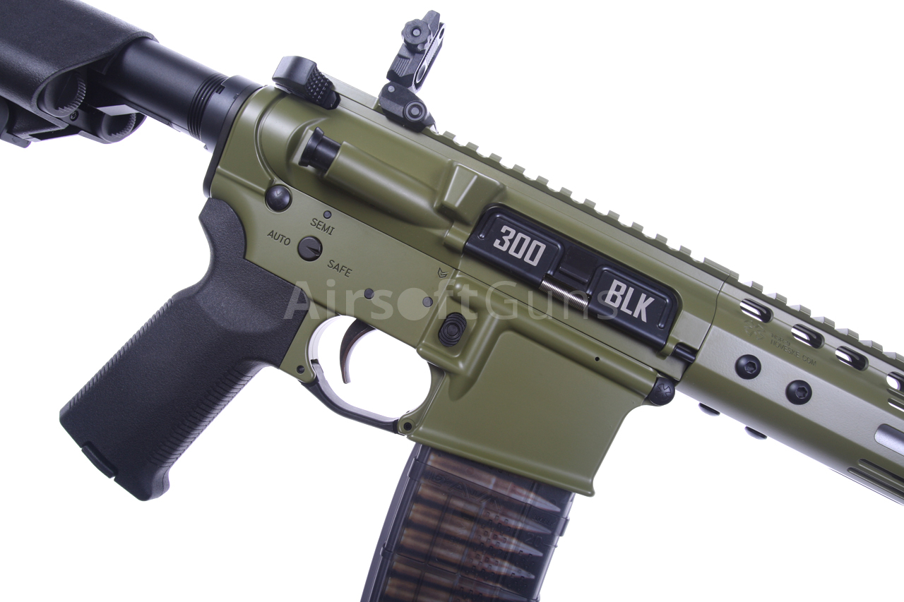 Táto skrátená verzia karabíny AR15 má krásne spracované telo v zelenej farbe Bazooka Green s originálnym razítkom Noveske (licencované spoločnosťou EMG) a jedinečným sériovým číslom. Zbraň je vybavená moderným CNC kovovým predpažbím Noveske NSR-9 M-Lok (dĺžka 9 palcov), ktoré je oveľa ľahšie a užšie ako štandardné RIS a preto zaručuje skvelý úchop. Moderný systém M-Lok umožňuje montáž taktického príslušenstva podľa preferencií každého používateľa.
