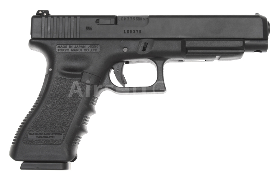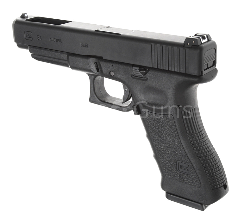 Plynová airsoftová zbraň so systémom Blow Back. Replika modela Glock 34 (3. generácie) od firmy Tokyo Marui, ktorá patrí už roky medzi najlepšia výrobca plynových pištolí na svete. Vierohodne spracovaná pištoľ s regulovateľným Hop-Up systémom, pohyblivým záverom a funkčným záchytom záveru. Model sa ďalej vyznačuje realistickú rozborku a všetkými funkčnými ovládacími prvkami. Pištoľ je štandardne osadená bielo zvýraznenými mieridlami (zadné hľadí má možnosť bočné regulácie) a lišta pred lucik umožňuje jednoduchú montáž taktické svietidlá.