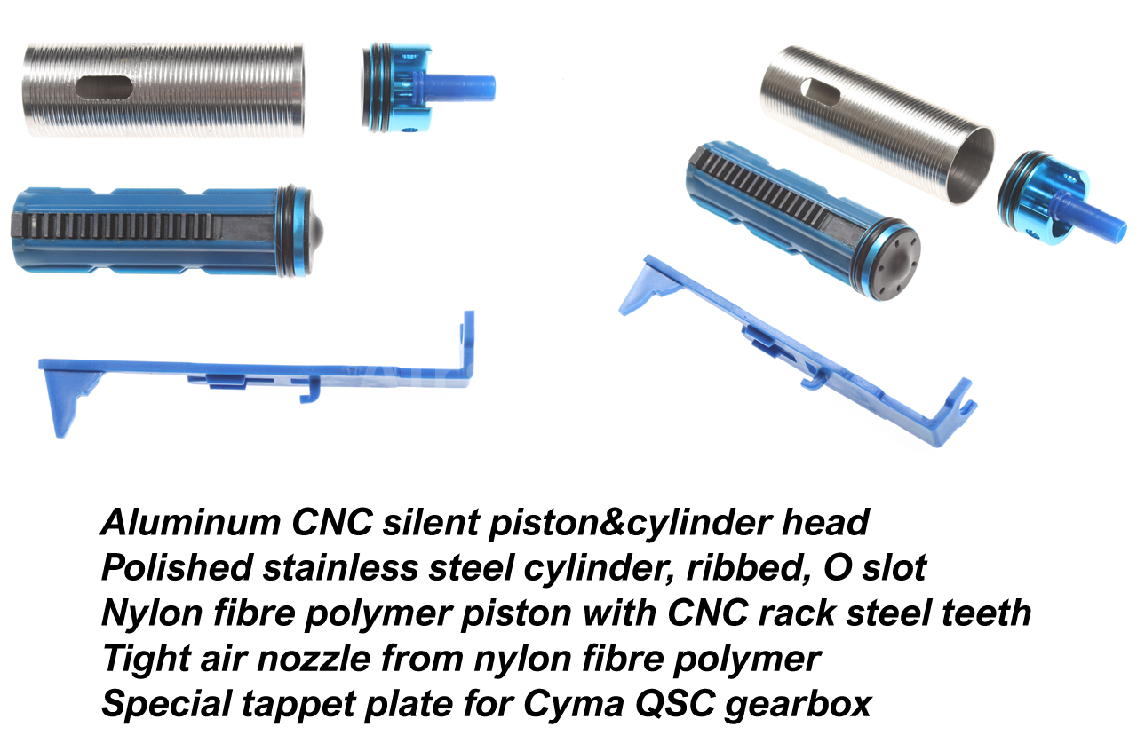 Kovová prevodovka typu QSC je extrémne vystužená v kritickej prednej časti (atypické ramienko), čo výrazne zvyšuje jej životnosť aj pri použití silnejších pružín. Cyma Platinum Edition je séria airsoftových replík s kompletným vylepšením, takže zbraň obsahuje špičkové CNC oceľové ozubené kolesá (rýchly pomer 13:1, krátky zdvih), polykarbonátový piest s oceľovými zubami na ozubenom hrebeni, presné 8 mm guľôčkové a kĺzavé ložiská, veľmi výkonný motor Cyma s neodýmovými magnetmi, oceľový QSC vodič pružiny s ložiskom, hliníkovú CNC hlavu valca (2 tesniace O-krúžky) a tichú hlavu piestu s ložiskom.