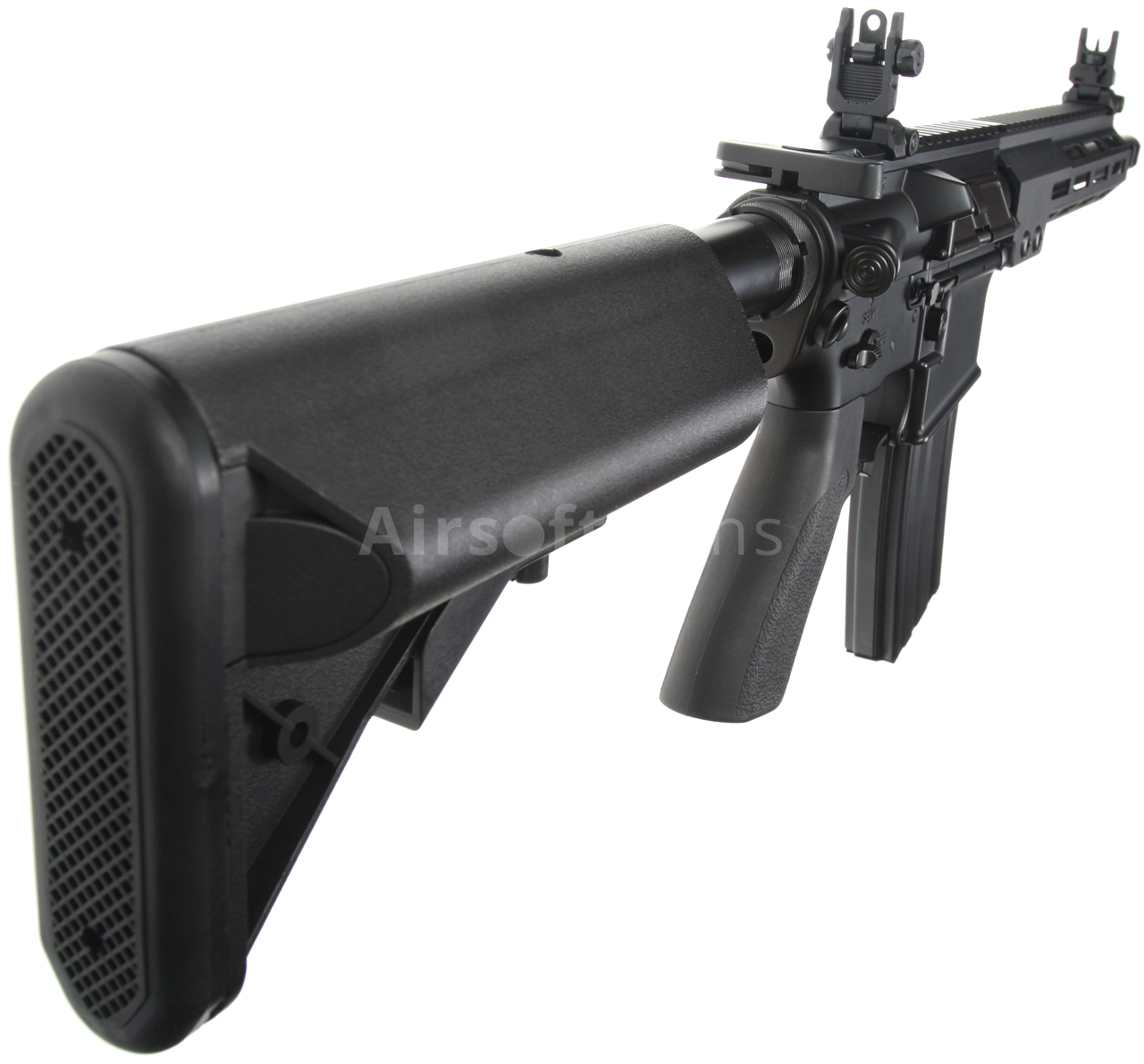 Zbraň je vybavená teleskopickou pažbou Crane Stock, ktorá ponúka 6 polôh nastavenia dĺžky a umožňuje vloženie odporúčaného typu LiPol batérie. Kovová vonkajšia hlaveň je vybavená robustným kovovým kompenzátorom, ktorý je pripevnený na ľavotočivý závit 14 mm.