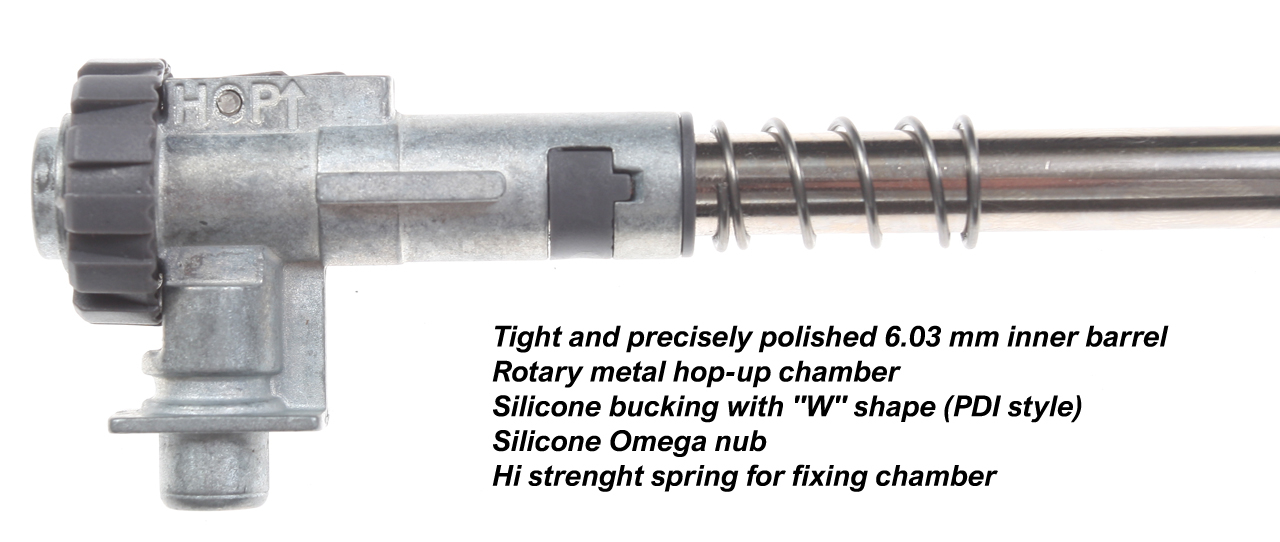 Mechabox obsahuje vysoko kvalitné oceľové ozubené kolesá (18:1), polykarbonátový piest s oceľovými zubami na ozubenom hrebeni, presné 8 mm guľôčkové a kĺzavé ložiská, veľmi výkonný motor Cyma s neodýmovými magnetmi, oceľový QSC vodič pružiny s ložiskom, hliníkovú CNC hlavu valca (2 tesniace O-krúžky) a tichú hlavu piestu s ložiskom. Jednodielna kovová komora Hop-Up, ktorá umožňuje podoprenie mechaboxu O-krúžkami, je tiež vítanou funkciou. To prirodzene zabezpečuje väčšiu stabilitu výkonu a výrazne predlžuje životnosť mechaboxu. Presná a precízne vyleštená vnútorná hlaveň s priemerom 6,03 mm nemá žiadne dodatočné nežiaduce povrchové úpravy, ktoré by mohli výrazne ovplyvniť presnosť a zoskupenie. Silikónová Hop-Up guma je typu PDI s moderným prýtlakom Omega.