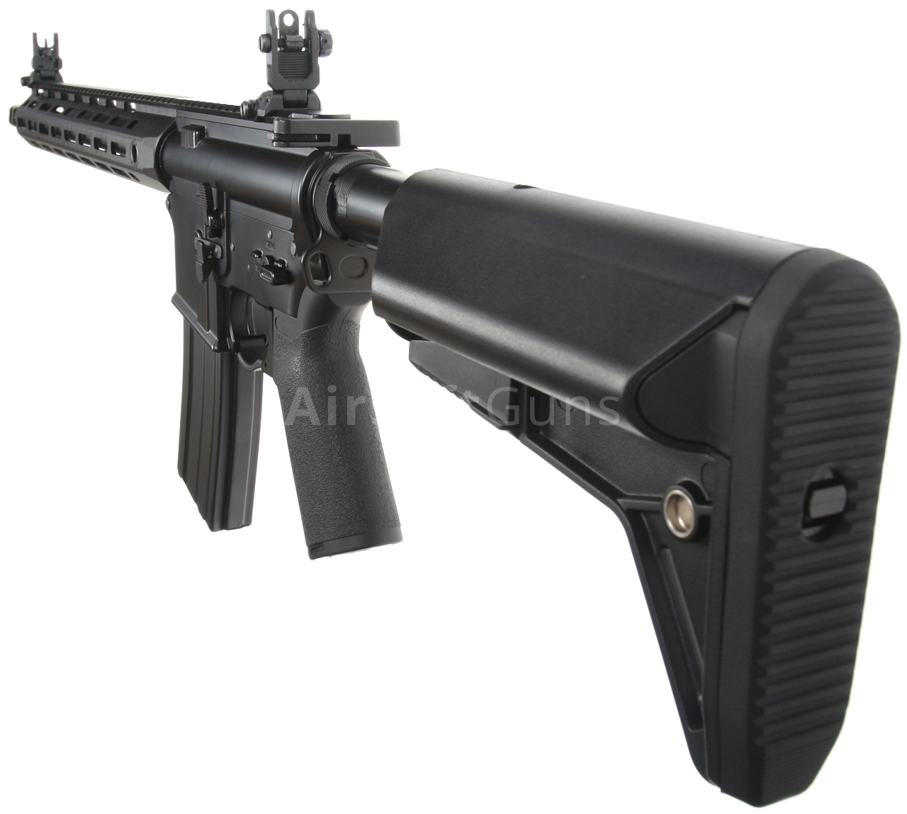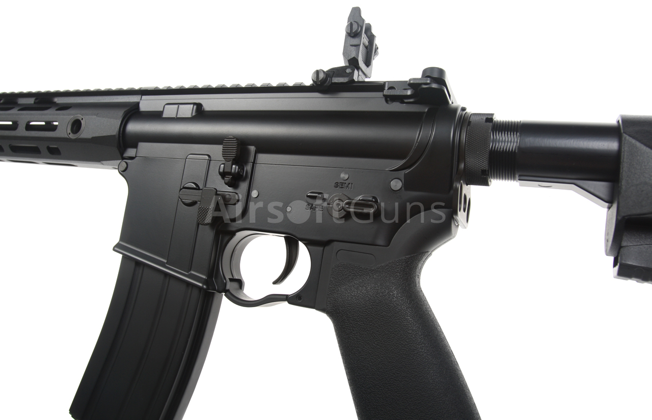 Zbraň je vybavená teleskopickou pažbou typu Magpul, ktorá ponúka 6 polôh nastavenia dĺžky a umožňuje vloženie odporúčaného typu LiPol batérie. Kovová vonkajšia hlaveň je vybavená robustným kovovým kompenzátorom, ktorý je pripevnený na ľavotočivý závit 14 mm.