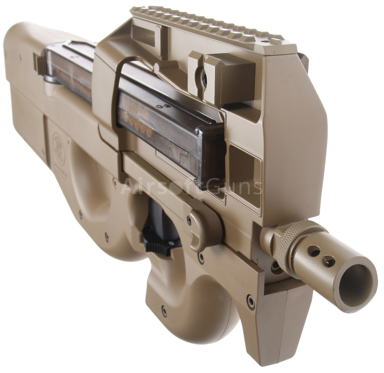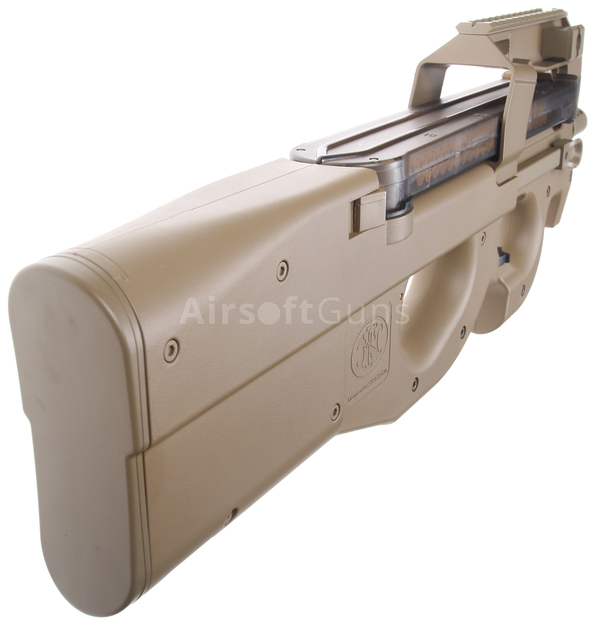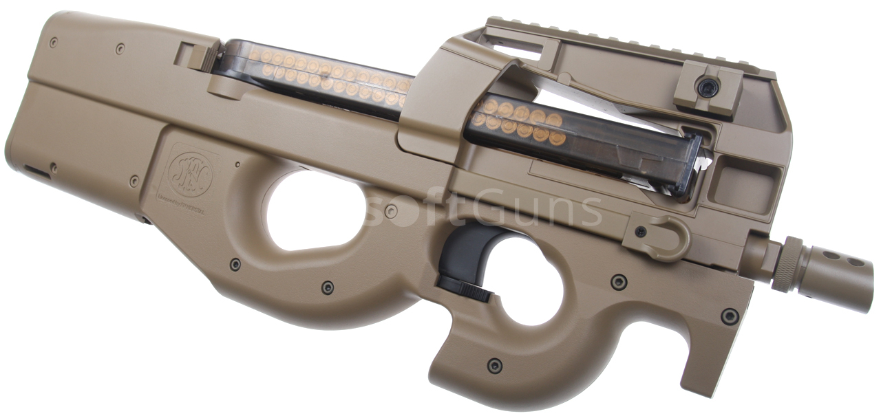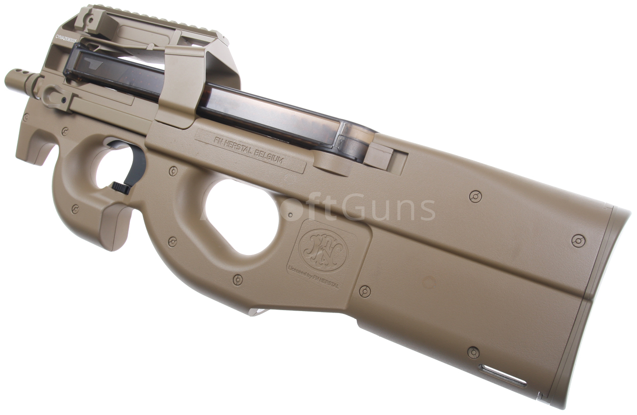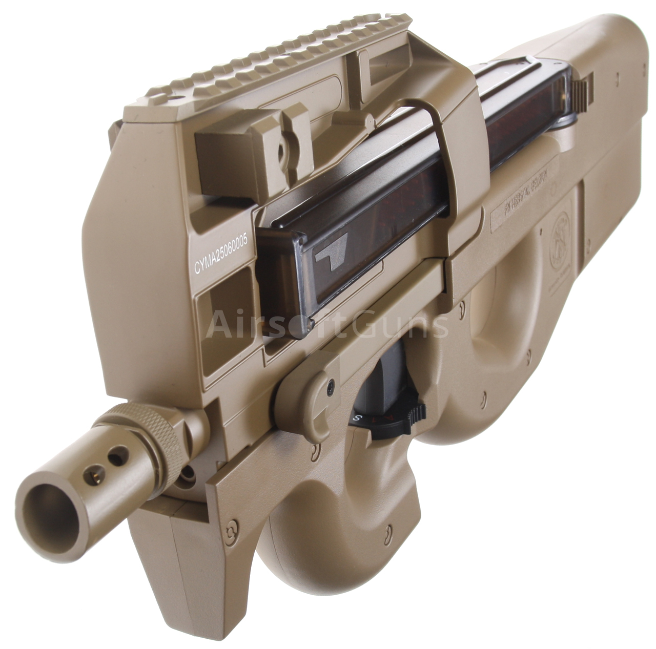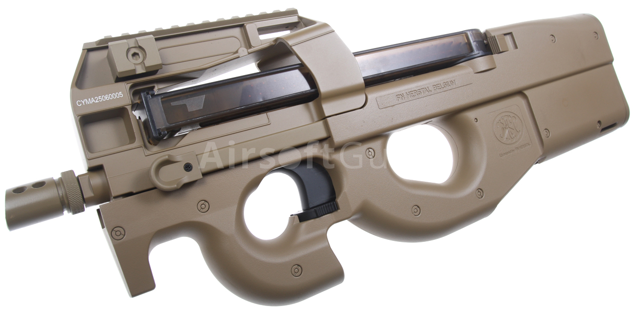 Elektrická airsoftová zbraň. Replika modelu P90 [CM.060 TN] od Cyma, vyrobená na základe licencie od FN Herstal a CyberGun v farbe TAN. Telo a základňa pažby sú zručne vyrobené z tvrdeného ABS plastu. Ide v podstate o známu verziu P90 TR (Triple Rail), v ktorej je celokovová horná časť vybavená tromi RIS lištami na upevnenie akéhokoľvek zameriavača a ďalšieho taktického príslušenstva. Typ a špecifický tvar tejto strelnej zbrane je širokej verejnosti dobre známy hlavne zo seriálu Stargate, v ktorom sa v určitej konfigurácii používala veľmi často. Vďaka menej bežnej konštrukcii bull-pup (zásobník za spúšťou) je dosiahnutá dlhá hlaveň pri zachovaní menších rozmerov celej zbrane, čo určite umožňuje lepšie použitie v menších priestoroch (CQB). Táto technológia tiež prispieva k celkovej príjemnej vyváženosti zbrane a tým k vynikajúcej manipulácii v ľavej aj pravej ruke.
