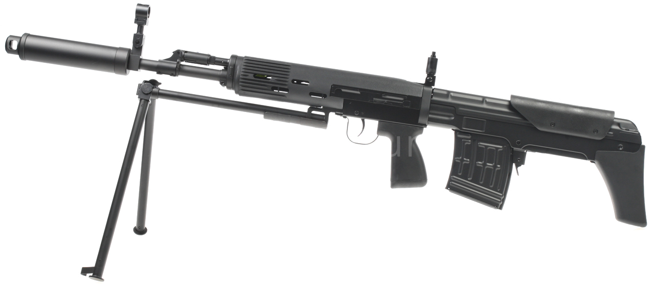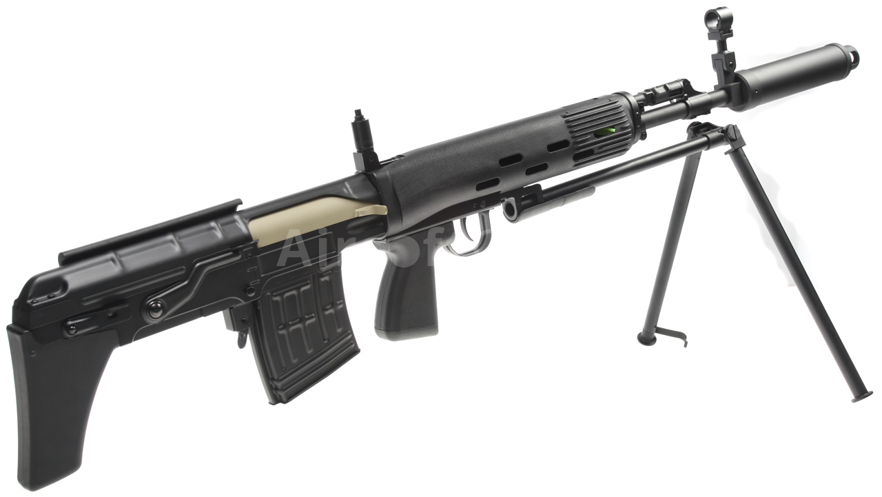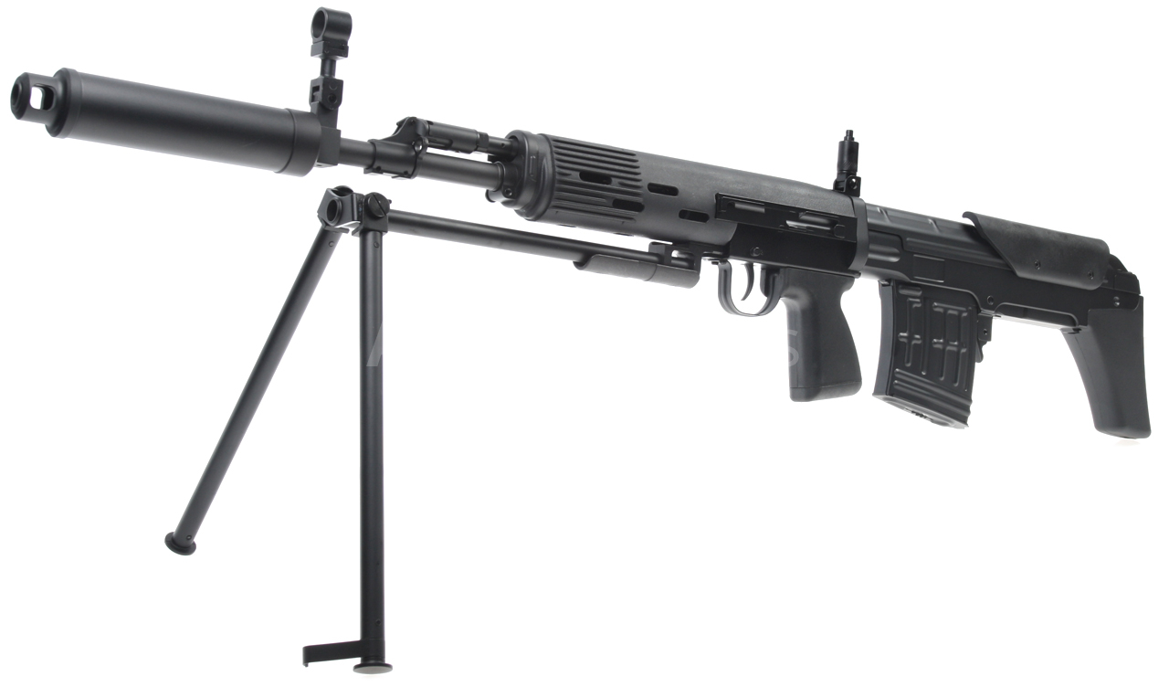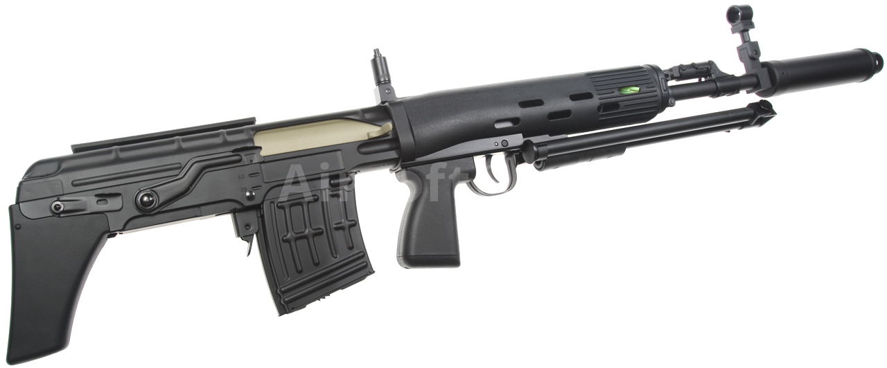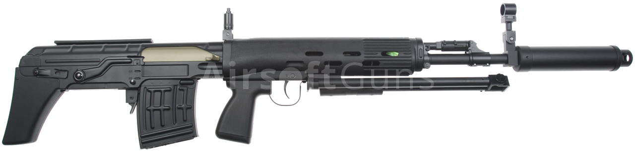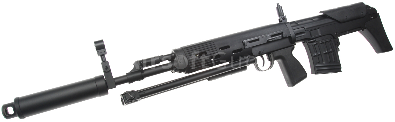Elektrická airsoftová zbraň. Replika pušky SVU [CM.057 SVU] Cyma Standard Edition BULLPUP v čiernej farbe s tlmičom a dvojnožkou. Modifikovaná a kompaktnejšia verzia známej pušky SVD Dragunov v BULLPUP dizajne, kde je zásobník zbrane umiestnený za spúšťou. Toto riešenie umožňuje použitie dlhej hlavne pri zachovaní celkovej kompaktnosti zbrane. Celokovová airsoftová replika je vybavená oceľovým sklopným dvojnožkom, lícnicou a tlmičom. Zadná slučka na popruh, lúčik spúšte, poistka zásobníka, kryt závorníka a ďalšie malé časti sú vyrobené z ocele. Na ľavej strane tela je lišta na montáž puškohľadu PSO alebo štandardná montážna základňa SVD s lištou RIS. Batéria sa vkladá do plastovej prednej časti.