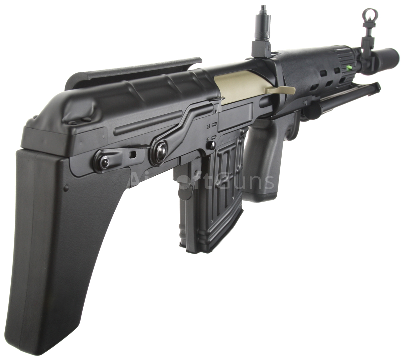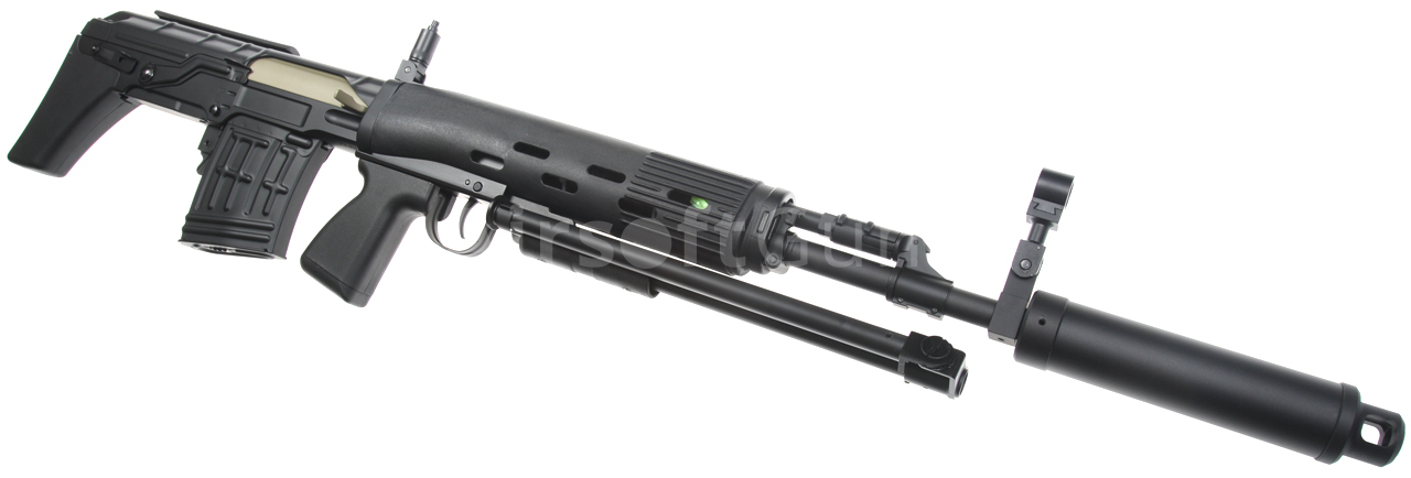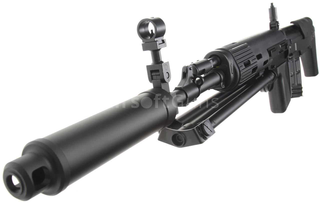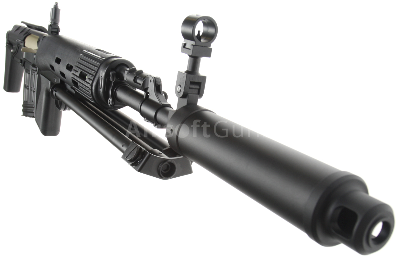Elektrická airsoftová zbraň. Replika pušky SVU [CM.057 SVU] Cyma Standard Edition BULLPUP v čiernej farbe s tlmičom a dvojnožkou. Modifikovaná a kompaktnejšia verzia známej pušky SVD Dragunov v BULLPUP dizajne, kde je zásobník zbrane umiestnený za spúšťou. Toto riešenie umožňuje použitie dlhej hlavne pri zachovaní celkovej kompaktnosti zbrane. Celokovová airsoftová replika je vybavená oceľovým sklopným dvojnožkom, lícnicou a tlmičom. Zadná slučka na popruh, lúčik spúšte, poistka zásobníka, kryt závorníka a ďalšie malé časti sú vyrobené z ocele. Na ľavej strane tela je lišta na montáž puškohľadu PSO alebo štandardná montážna základňa SVD s lištou RIS. Batéria sa vkladá do plastovej prednej časti.