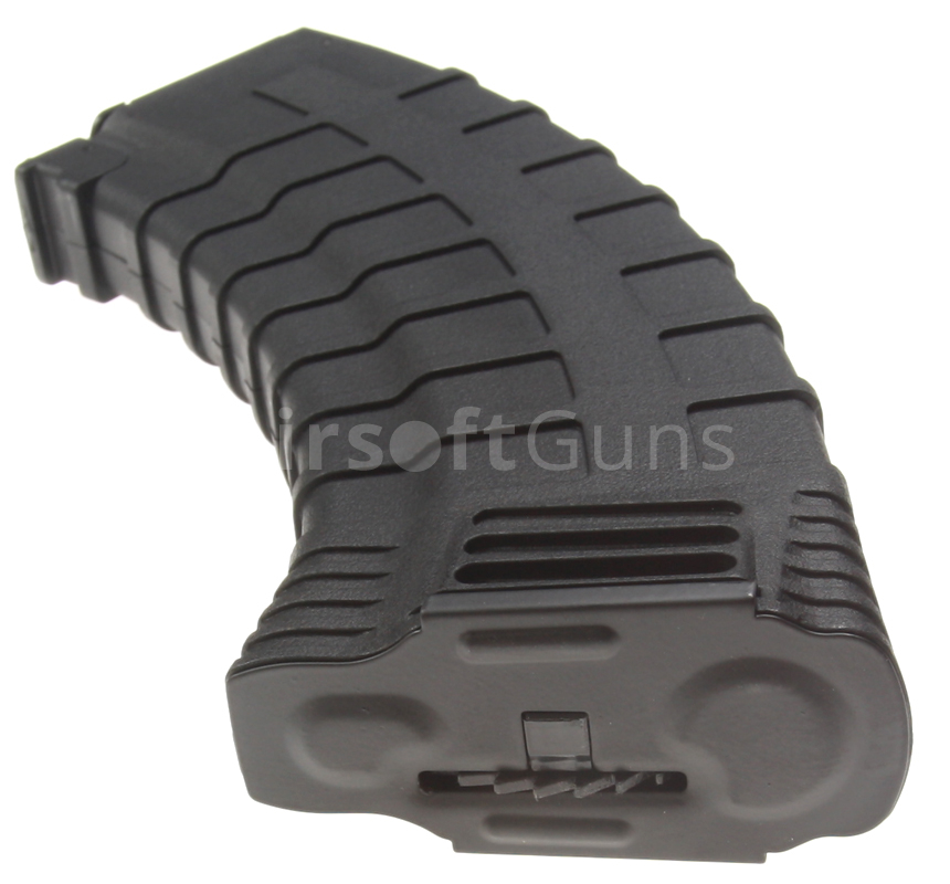 Naťahovací zásobník (Hicap) pre zbrane AK47 a AKM AEG od Cyma. Čierny zásobník je vyrobený z ľahkého, tvrdého polyméru v štýle TAPCO.